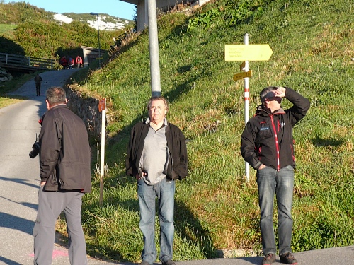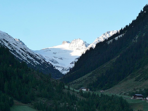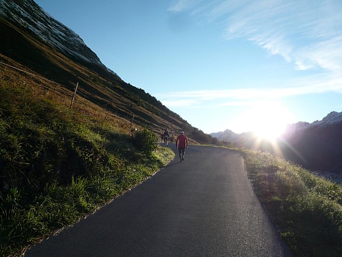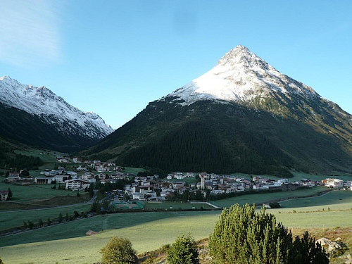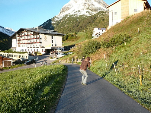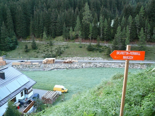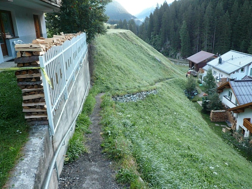 Die Almwiesen sind gescheit angereift, doch oberhalb, wo unser Kurs wieder Richtung Osten führt, läuft die Spitze bereits in der Sonne. Nach links sehe ich die 2558 Meter hohe Gorfenspitze und vor mir die 2671 Meter hohe Ballunspitze, die Hausberge Galtürs. An der Ballunspitze läuft im Winter der Skizirkus auf Hochtouren. Im Sommer nimmt die Birkhahnbahn dem Wanderer einige Höhenmeter bequem auf seiner Wanderung ab. Auf der Höhe des Ortsteils Wirl (1650 Meter) nimmt die Steigung kurzzeitig zu, bevor wir nach rechts abbiegen. Die Marschierer ziehen ansteigend gerade weiter.