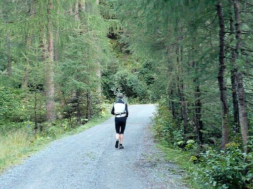Hinter einer Garage geht es auf einem schmalen Pfad nach unten und wir überqueren bei einem Sägewerk die Trisanna. Auf den nächsten drei, vier Kilometer kommt im Maißwald eine knüppeldicke Steigung hoch zur Lareinalm (1860 Meter). 330 Höhenmeter sind da zu bezwingen. Teilweise stärker steigend, teilweise etwas moderater wartet die Steigung auf die Läufer. Im Wald ist es noch sehr kühl. Aber die Läufer sind jetzt warm gelaufen und fröhlich unterwegs. Das Rennen macht Spass, auch wenn mitunter wieder eine Geheinlage fällig wird.