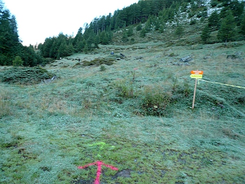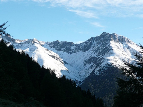 Kurz vor der Lareinalm verlassen wir den Wald und den befestigten Weg. Eindrucksvoll ist der Blick nach Süden auf den Lareinferner und dem 3399 Meter hohem Fluchthorn. Ein paar Meter geht es fast weglos durch eine Almwiese. Farbmarkierungen sind jedoch auf dem Boden angebracht. Teilweise liegen noch gefrorene Schneereste von Vortag herum. Dann taucht urplötzlich die Lareinalm auf, wo wieder eine opulent ausgestattete V-Stelle wartet.