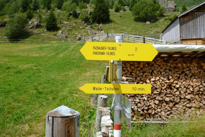 Kurz nach der Mentaalm (auch bewirtschaftet) verlassen wir die Jamtalstraße und biegen links in einen Wiesenweg ein. Schon nach einigen Minuten bin ich in Galtür, die nächste V-Stelle wartet.
