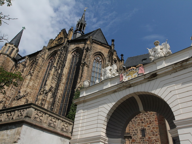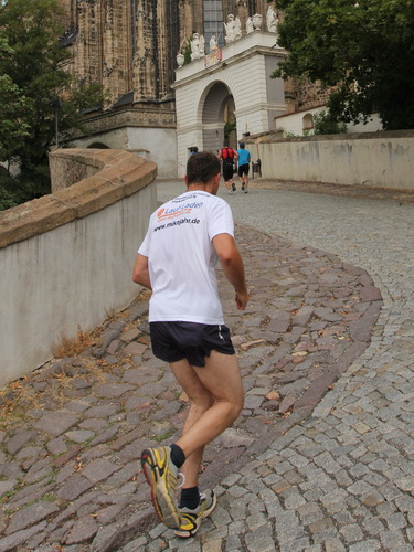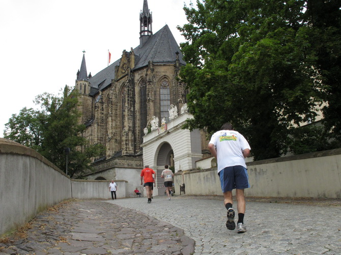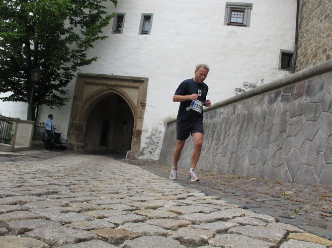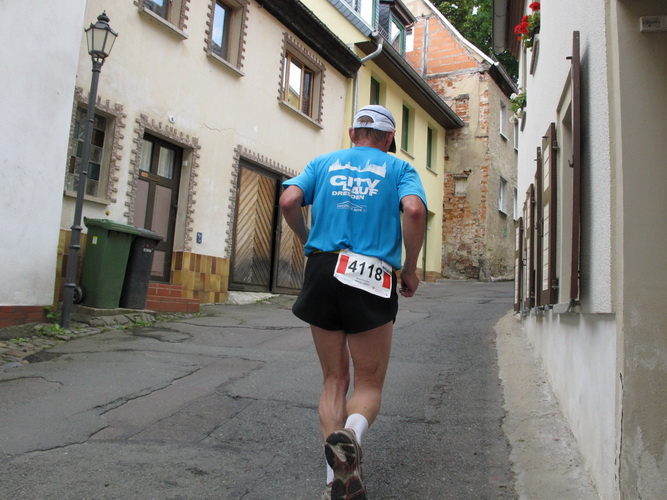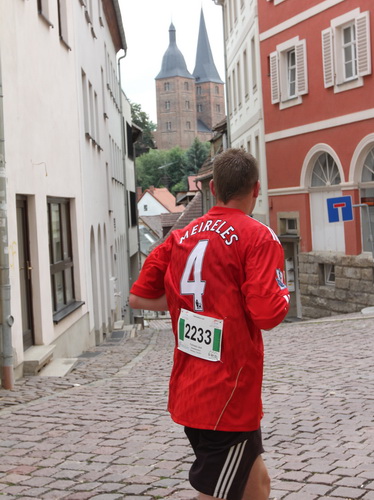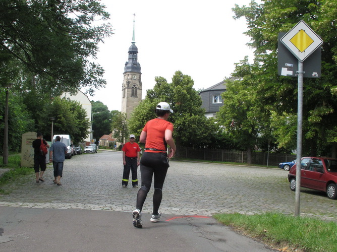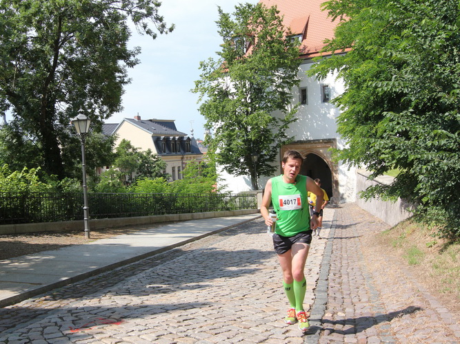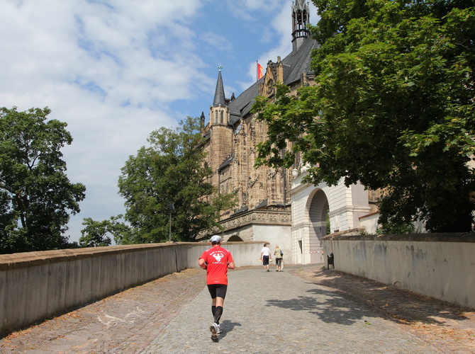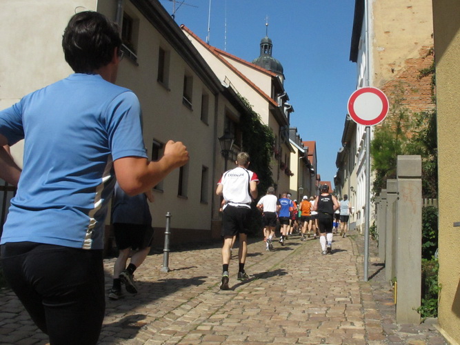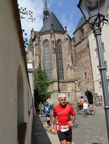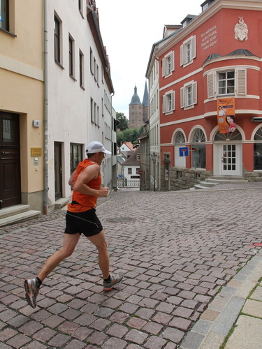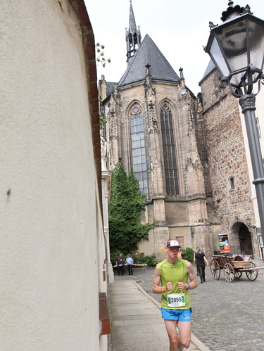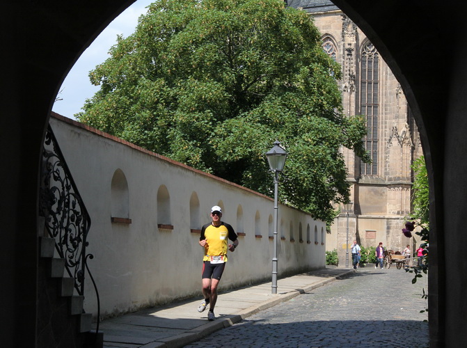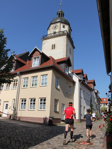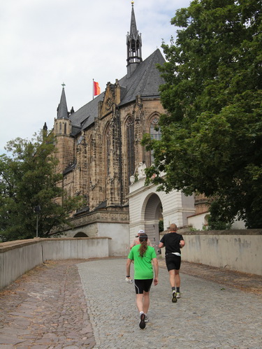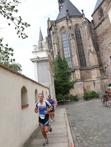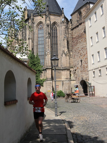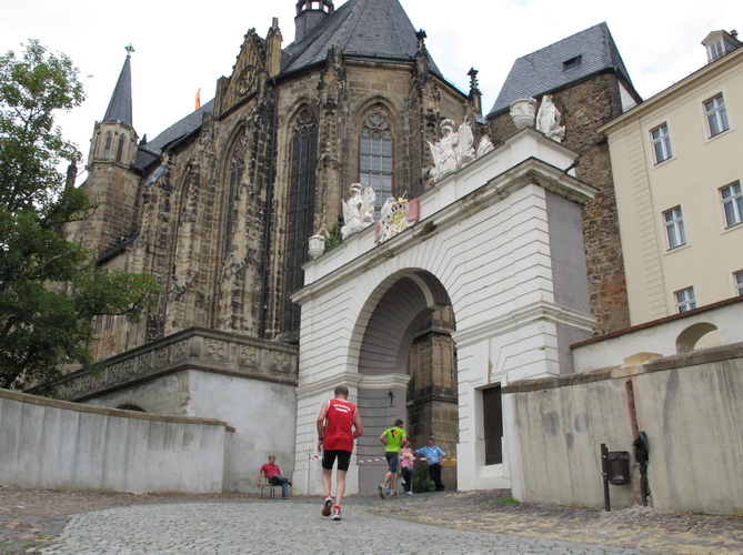 Eine urige gepflasterte Gasse geht es abwärts. Mit Riesenschritten überholt mich Silvia Schmied – sie gewinnt den Marathon. Auch ihre Schritte werden gleich wieder kürzer, denn der Gegenanstieg ist diesmal nicht ohne, allerdings nur kurz. Dann sind wir beim Altenburger Wahrzeichen, den Roten Spitzen. Die beiden Backsteintürme sind Reste der zum Augustinerkloster gehörenden Kirche, zu deren Einweihung 1172 auch Kaiser Barbarossa angereist war. 1618 verpasste man einem der Türme eine barocke Haube.
