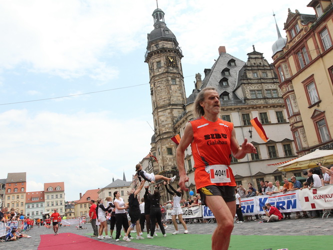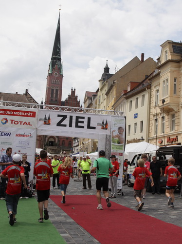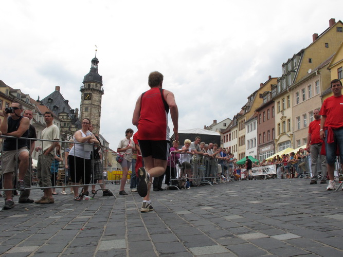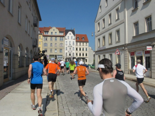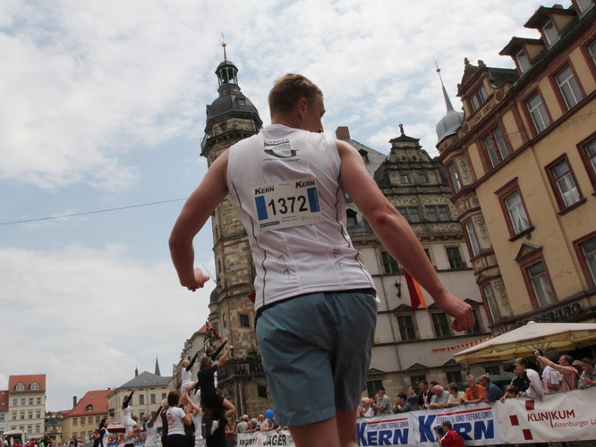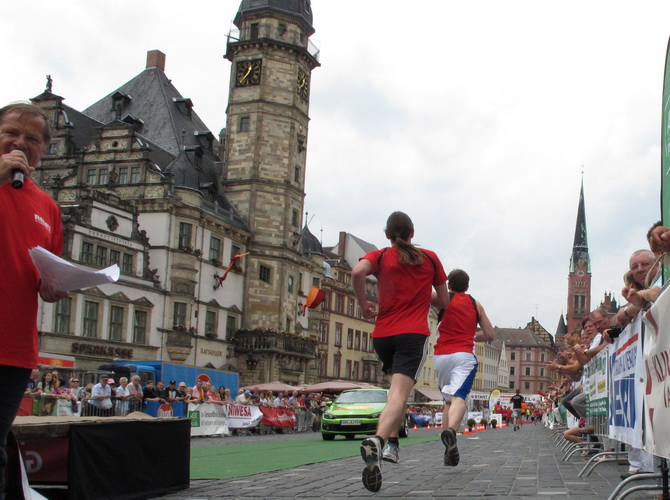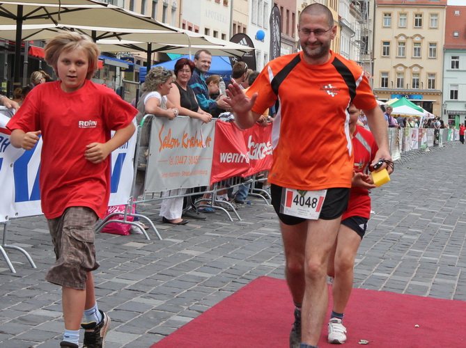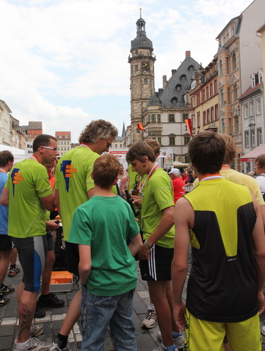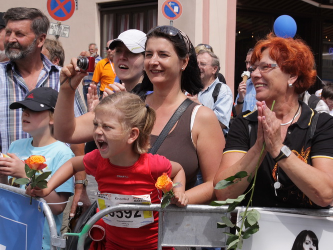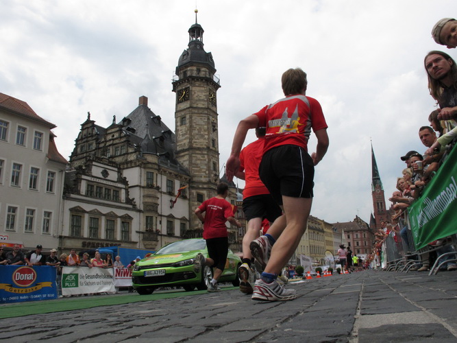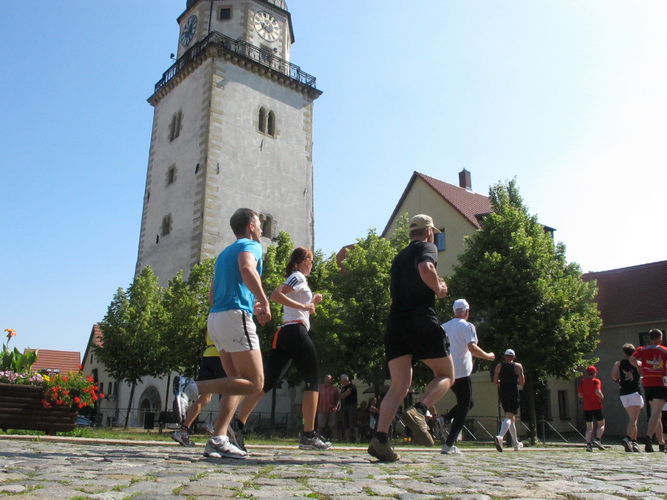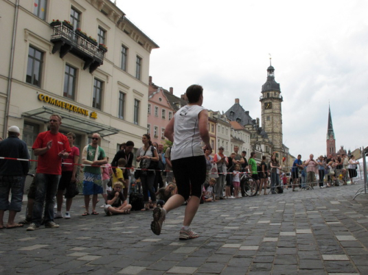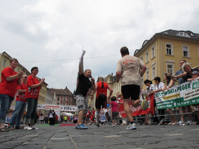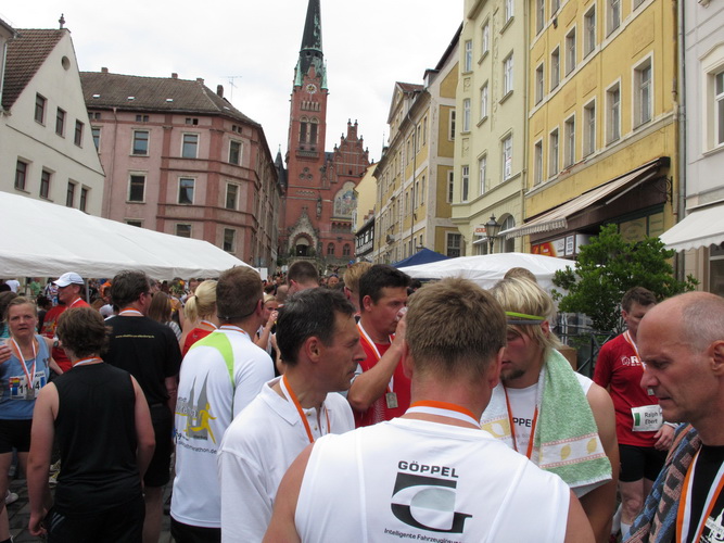 Keine Chance für Morgenmuffel, Stefan Bräuer als Moderator, Animateur und Kommentator und „Die Unkomplizierten“ mit ihrer Live-Musik heizen ohne Gnade ein. „Highway to hell“ am frühen Morgen. Im Nu füllt sich der Platz. Als erstes sind um 9.00 Uhr die Marathonis an der Reihe. Stars sind keine namenlosen Ostafrikaner sondern Läufer aus der Region und die Laufverrückten, die man halt überall trifft. Weil nach dem Marathon verschiedene Kinder- und Jugendläufe gestartet werden und jeder der Nachwuchsläufer mit mind. 4köpfigem Team (Mama, Papa, Oma und Patenonkel) antritt, ist der Platz gleich proppenvoll. Da blicken der OB und die Verantwortlichen stolz auf das, was private Initiative zustande bringt, in die Runde.