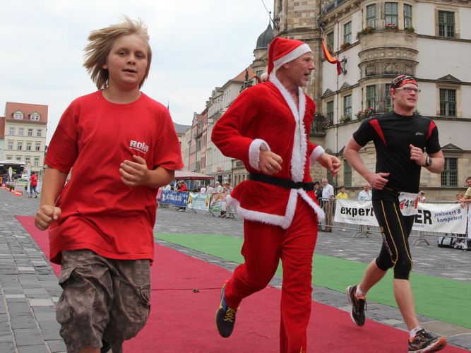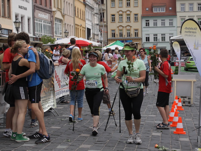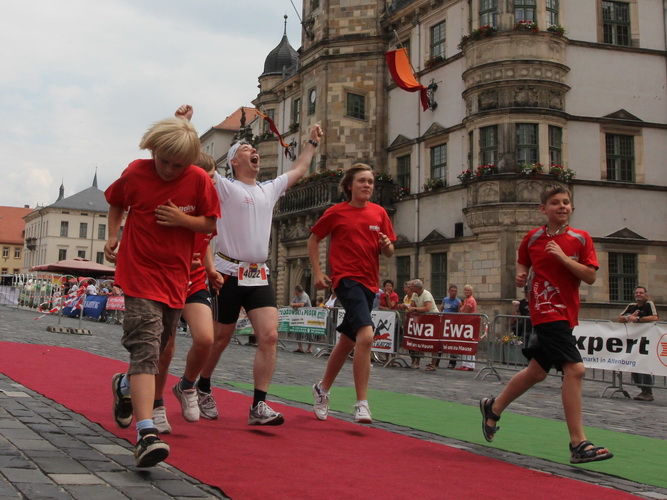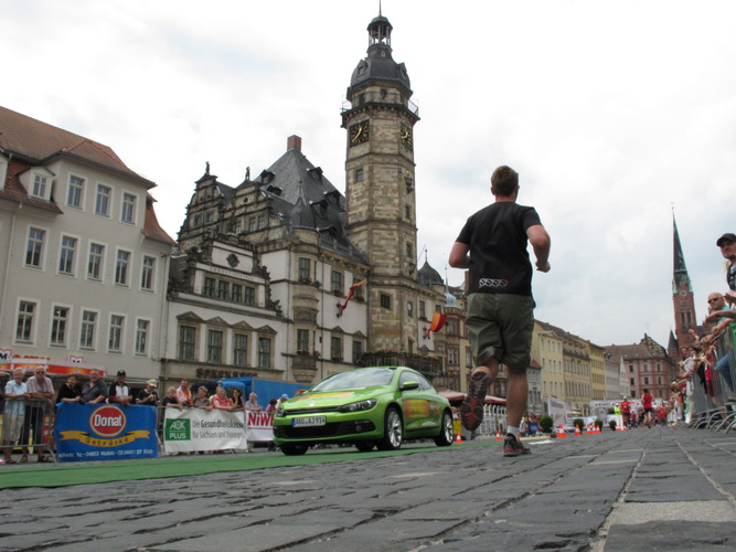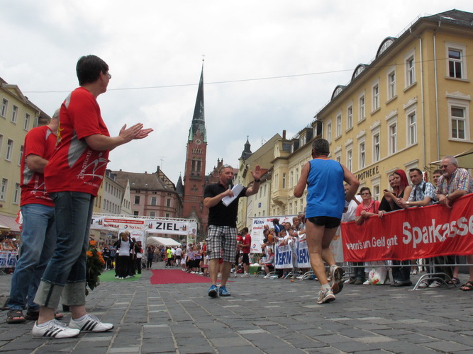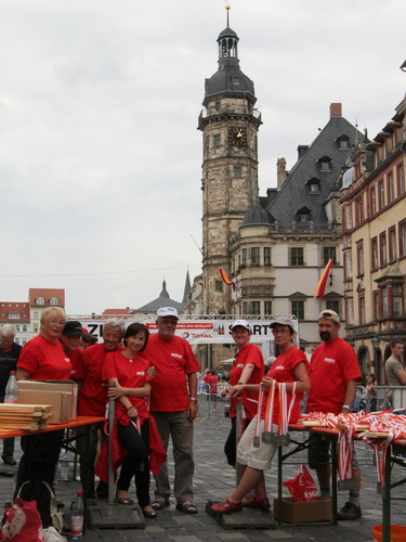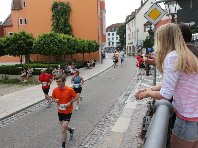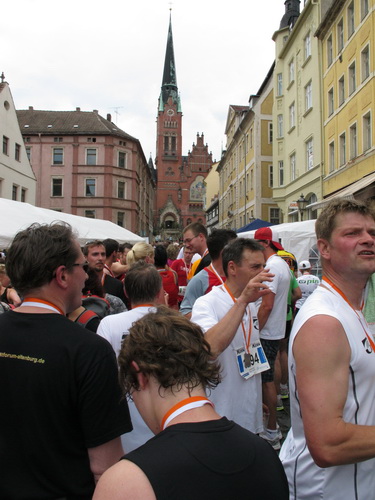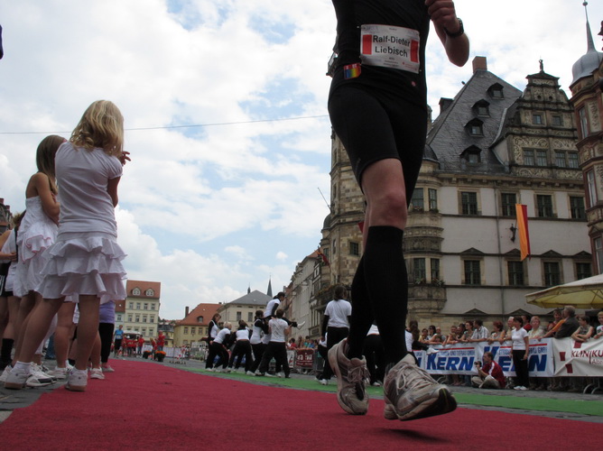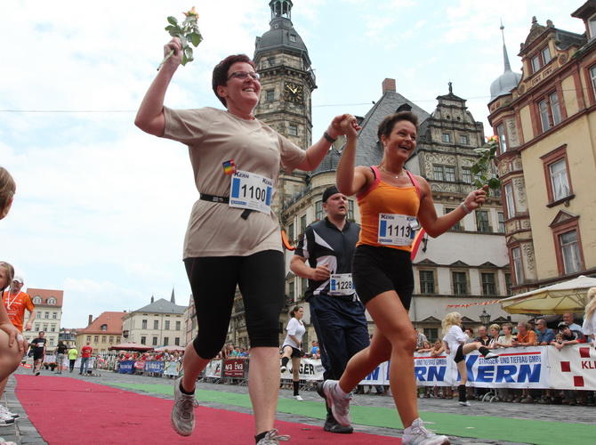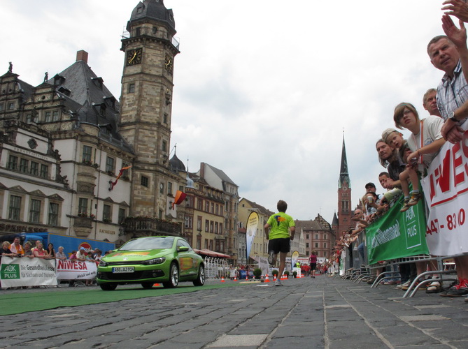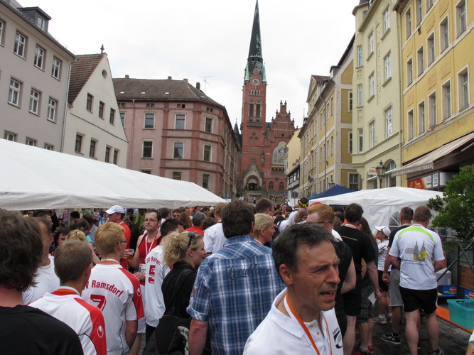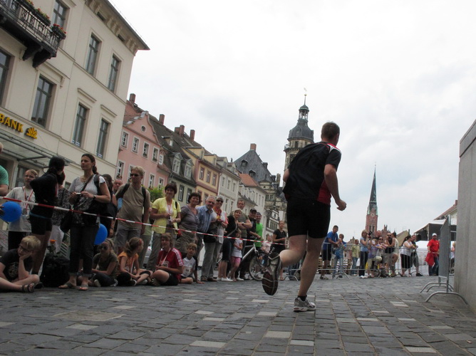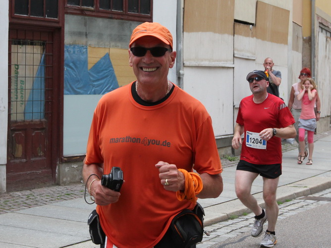 Keine Chance für Morgenmuffel, Stefan Bräuer als Moderator, Animateur und Kommentator und „Die Unkomplizierten“ mit ihrer Live-Musik heizen ohne Gnade ein. „Highway to hell“ am frühen Morgen. Im Nu füllt sich der Platz. Als erstes sind um 9.00 Uhr die Marathonis an der Reihe. Stars sind keine namenlosen Ostafrikaner sondern Läufer aus der Region und die Laufverrückten, die man halt überall trifft. Weil nach dem Marathon verschiedene Kinder- und Jugendläufe gestartet werden und jeder der Nachwuchsläufer mit mind. 4köpfigem Team (Mama, Papa, Oma und Patenonkel) antritt, ist der Platz gleich proppenvoll. Da blicken der OB und die Verantwortlichen stolz auf das, was private Initiative zustande bringt, in die Runde.