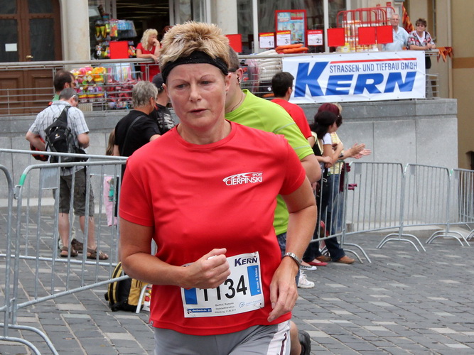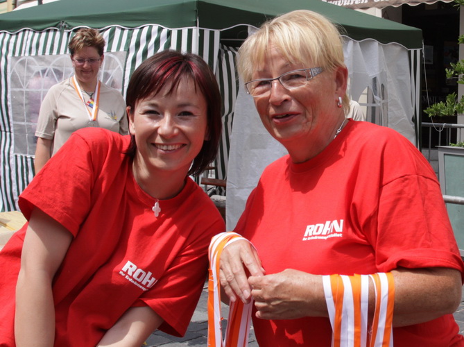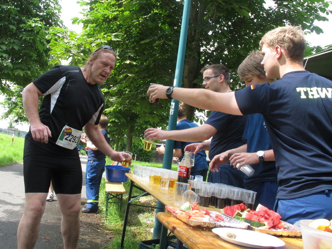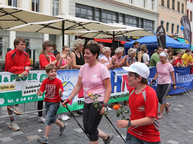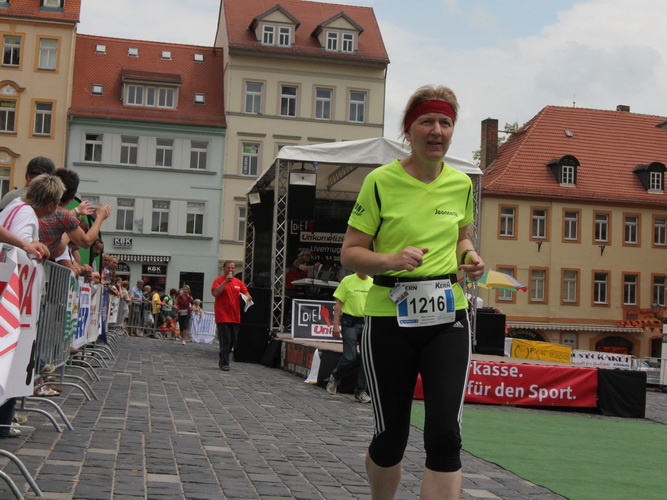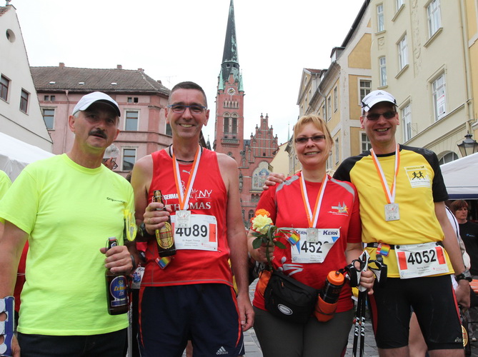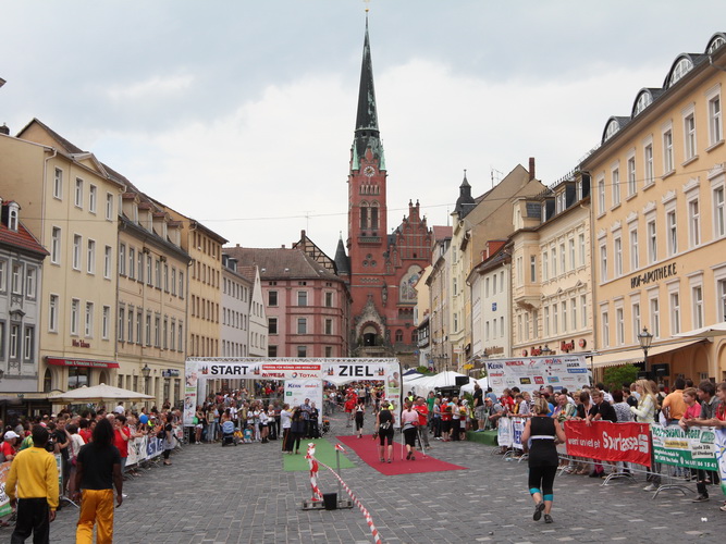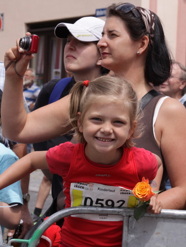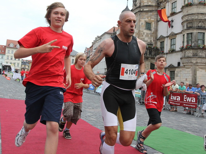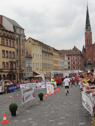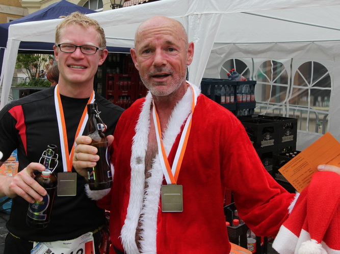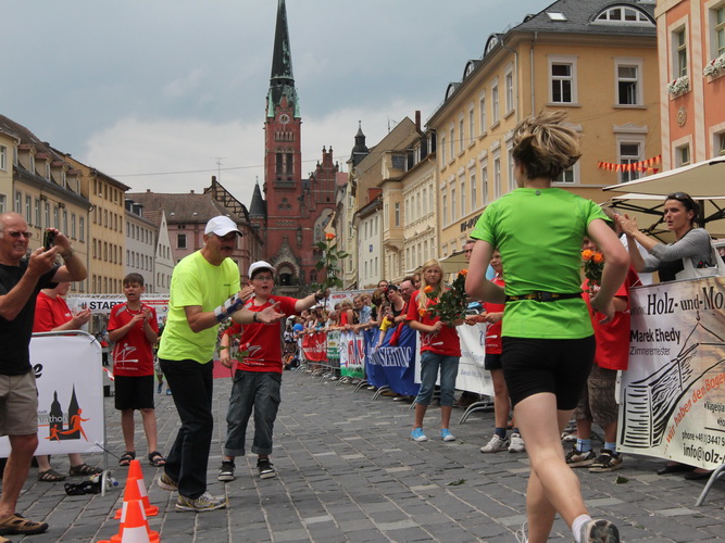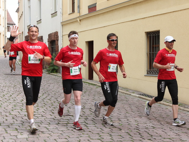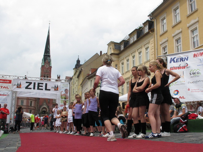 Keine Chance für Morgenmuffel, Stefan Bräuer als Moderator, Animateur und Kommentator und „Die Unkomplizierten“ mit ihrer Live-Musik heizen ohne Gnade ein. „Highway to hell“ am frühen Morgen. Im Nu füllt sich der Platz. Als erstes sind um 9.00 Uhr die Marathonis an der Reihe. Stars sind keine namenlosen Ostafrikaner sondern Läufer aus der Region und die Laufverrückten, die man halt überall trifft. Weil nach dem Marathon verschiedene Kinder- und Jugendläufe gestartet werden und jeder der Nachwuchsläufer mit mind. 4köpfigem Team (Mama, Papa, Oma und Patenonkel) antritt, ist der Platz gleich proppenvoll. Da blicken der OB und die Verantwortlichen stolz auf das, was private Initiative zustande bringt, in die Runde.