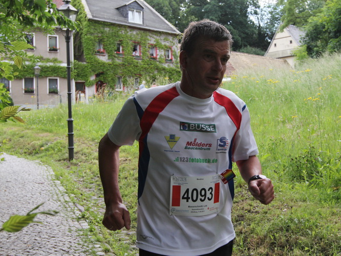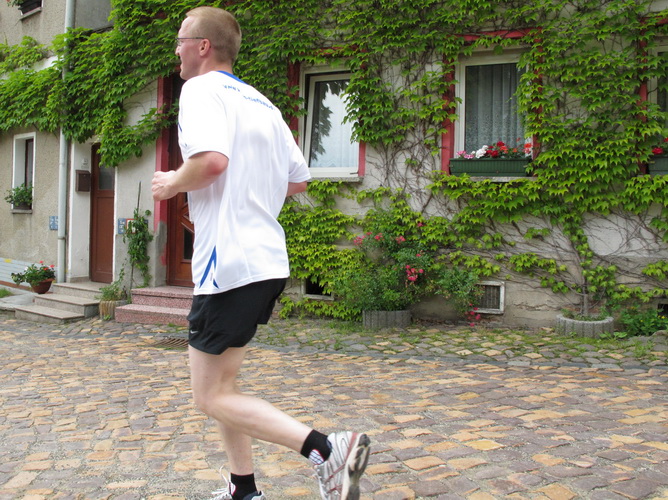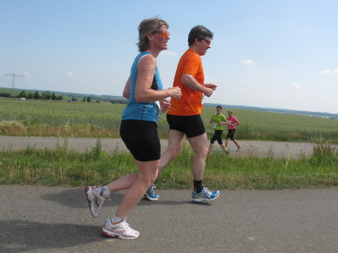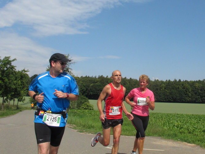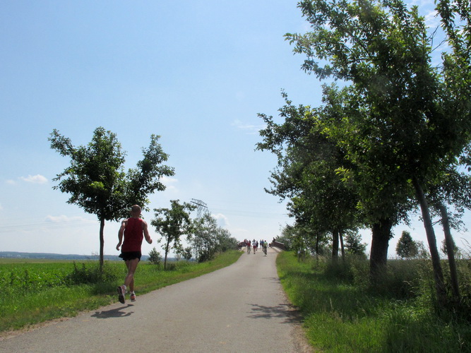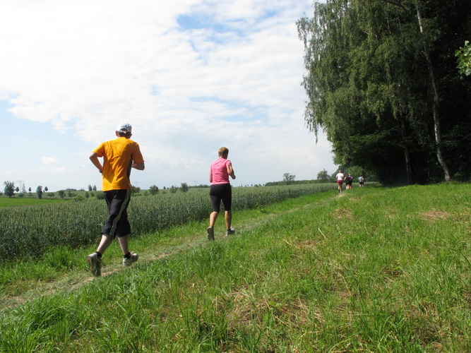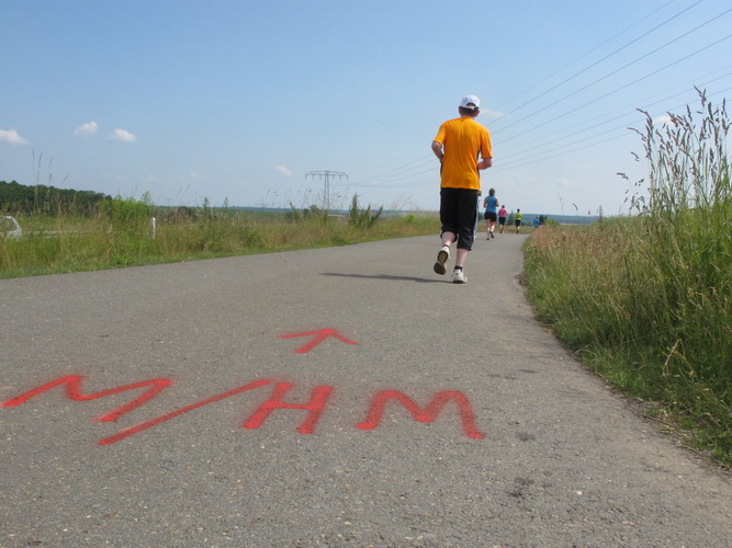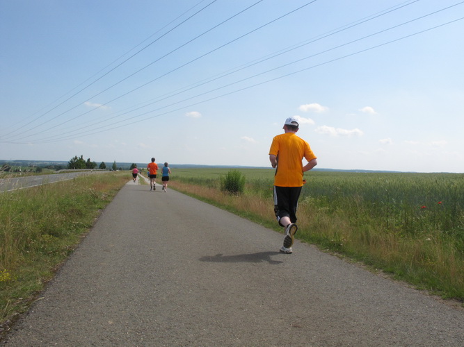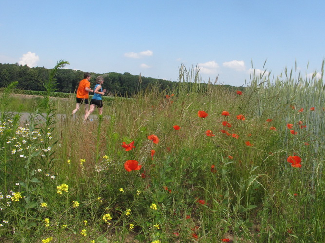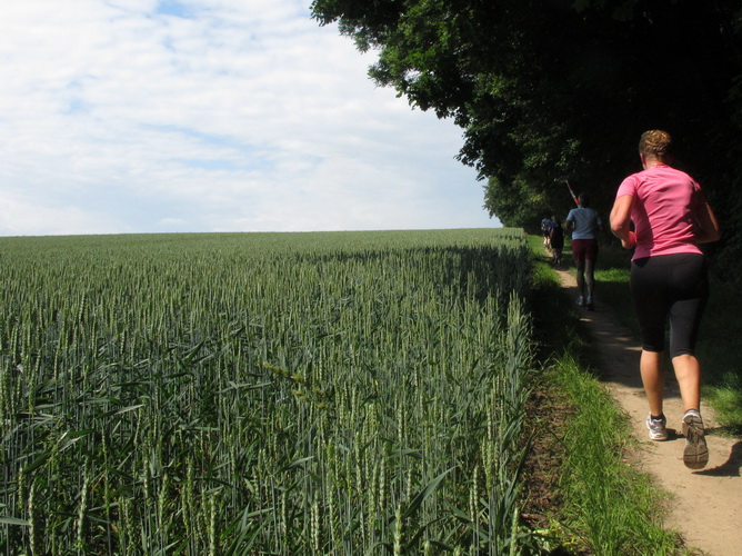 Nach einem weiteren Kilometer führt uns ein schmaler Pfad (neudeutsch: Trail) am Waldrand entlang hinauf zur Paditzer Straße. Wir schauen über große Weizenfelder und Wiesen. Es ist warm geworden. Der Schweiß fließt in Strömen. Statt zu klagen, nimmt man hin, was man sich ja selber eingebrockt hat und passt sein Tempo der Temperatur und dem Gelände an. Nur einer zieht gnadenlos durch: Steven Michel. Er ist der erste Marathonläufer, der uns überholt. Er gewinnt auch mit großem Vorsprung.