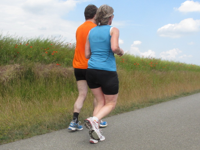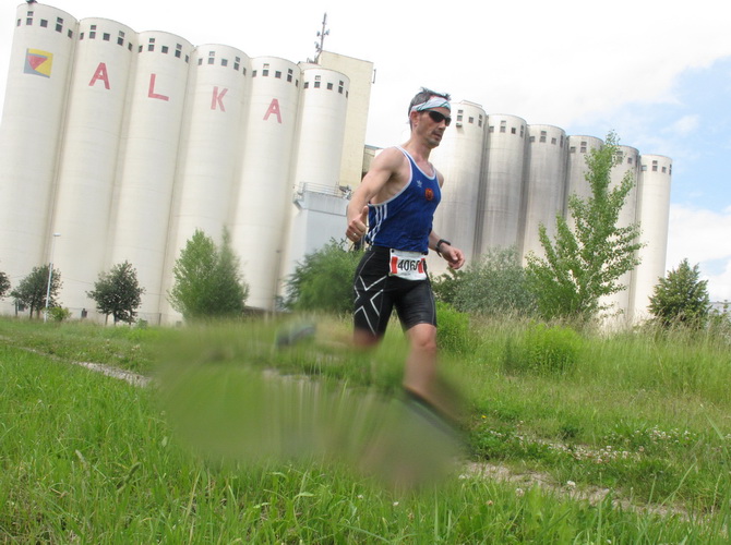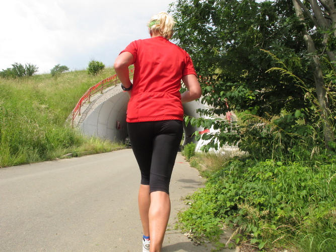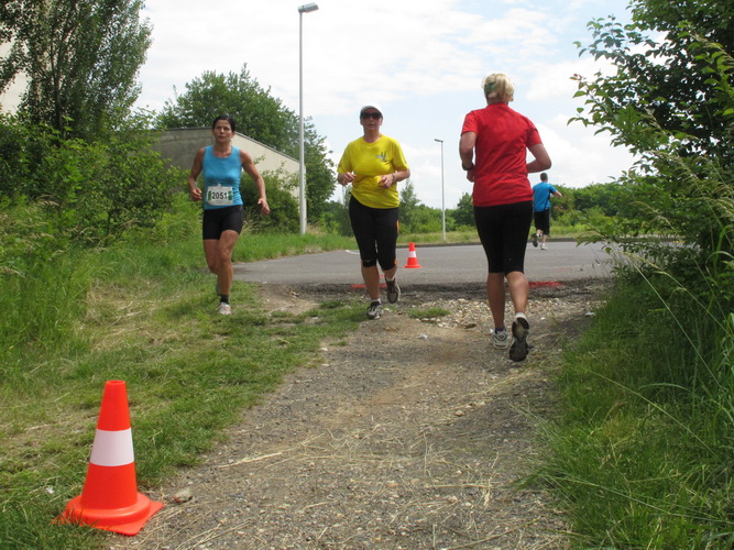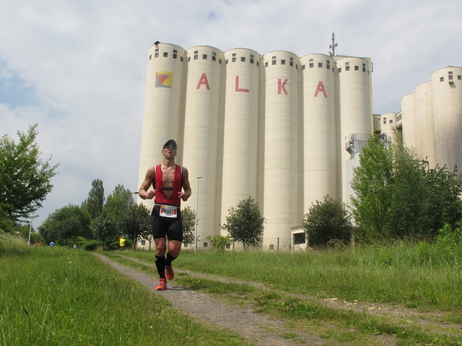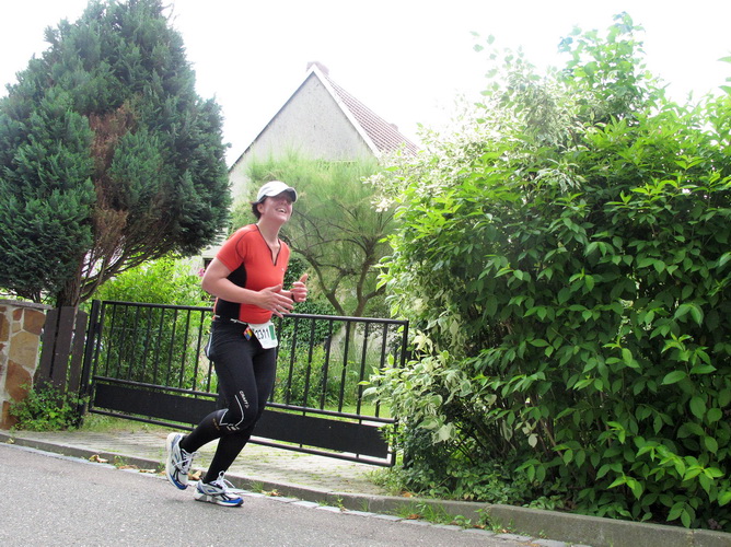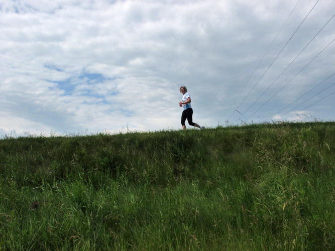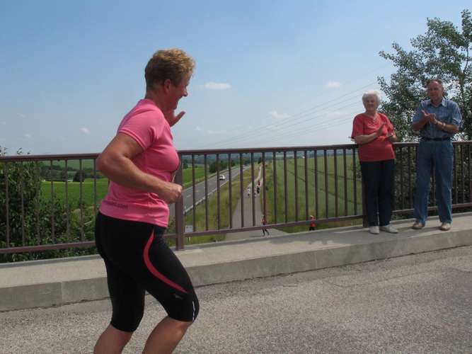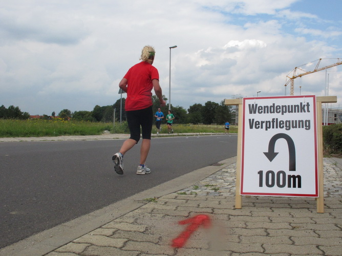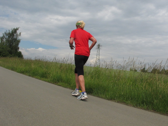 Nach einem weiteren Kilometer führt uns ein schmaler Pfad (neudeutsch: Trail) am Waldrand entlang hinauf zur Paditzer Straße. Wir schauen über große Weizenfelder und Wiesen. Es ist warm geworden. Der Schweiß fließt in Strömen. Statt zu klagen, nimmt man hin, was man sich ja selber eingebrockt hat und passt sein Tempo der Temperatur und dem Gelände an. Nur einer zieht gnadenlos durch: Steven Michel. Er ist der erste Marathonläufer, der uns überholt. Er gewinnt auch mit großem Vorsprung.