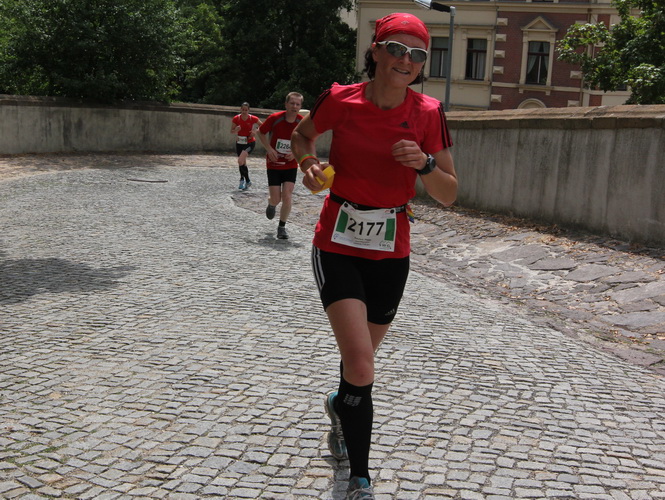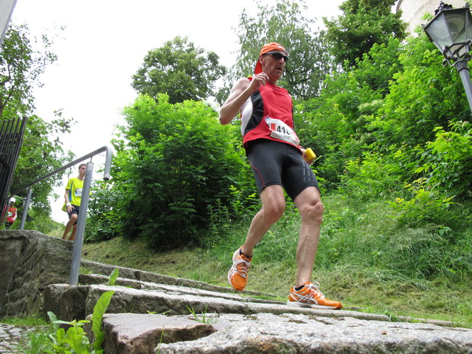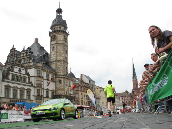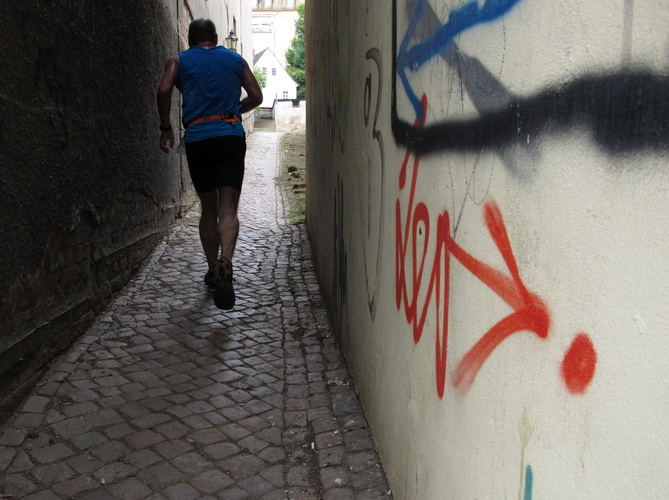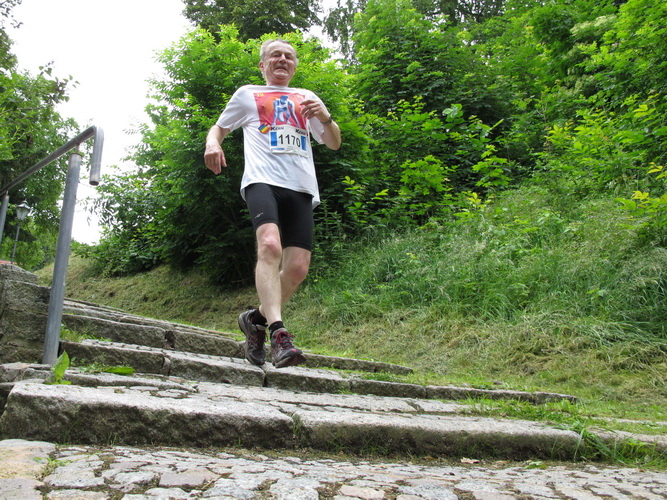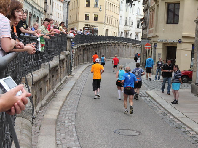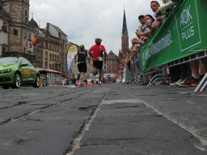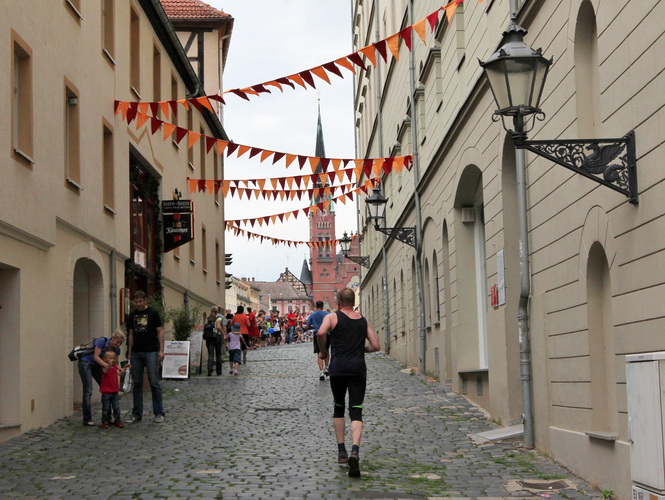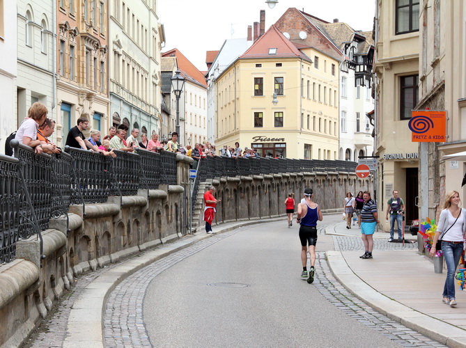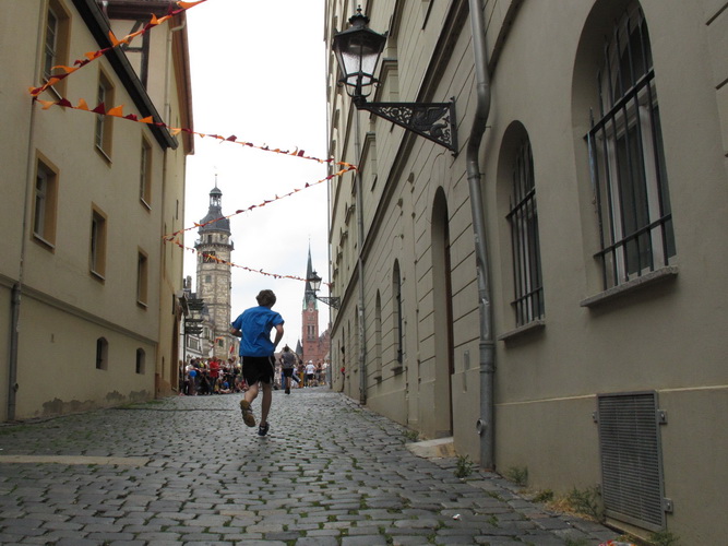 Am Zwinger vorbei verlassen wir durch das Torhaus, das ursprünglich der einzige Zugang war, das Schloss. Eine romantische Gasse endet für uns jäh an dem Schild, das vor einer Treppe warnt. Die lassen hier nichts aus. Die einen stürzen sich zaghaft, die anderen mutig ins Vergnügen. Was folgt ist eine Gasse, so schmal, dass nicht mal zwei Läufer nebeneinander laufen können. Jetzt noch der Skatbrunnen mit den drei raufenden Wenzeln, dann läuft man die Marktgasse rauf. Man ist noch nicht oben, schon wird man begeistert gefeiert.