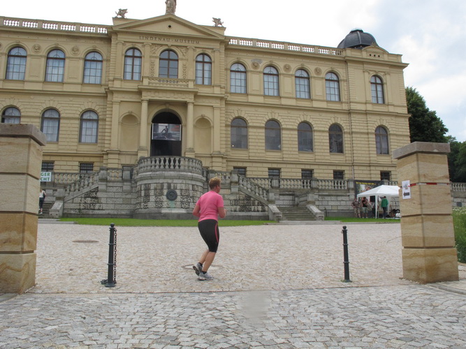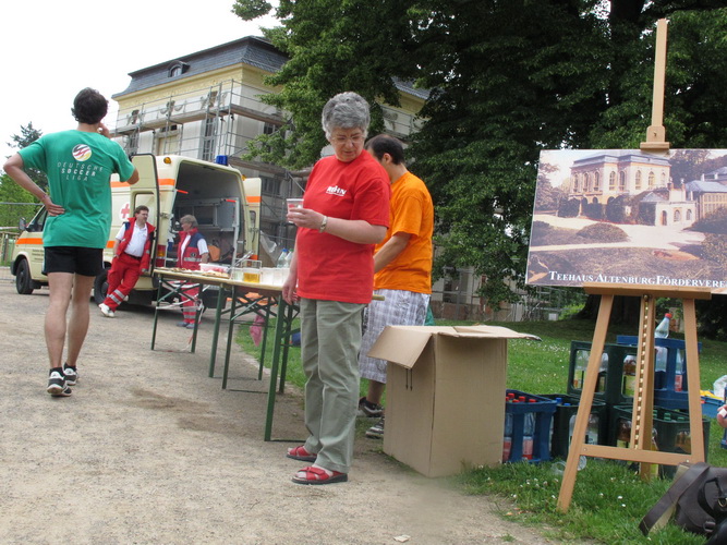 Beim Lindenau-Museum beginnt der erste Ansturm auf den Schlossberg, der von fetziger Musik begleitet wird. „Don’t stop“ dröhnt es aus den Lautsprechern. Die Rolling Stones, wie von mir bestellt. Trommler und ein paar Zuschauer sorgen für weitere Motivation. Oben ist eine Grillparty. Ich bekomme Lob für meinen Foto-Job, aber eine Bratwurst kriege ich nicht. Notgedrungen greife ich bei den Bananen zu, die es beim Teehaus im Schlossgarten gibt. Das herzogliche Lusthaus wurde 1706 erbaut und bekommt gerade eine neue Fassade.