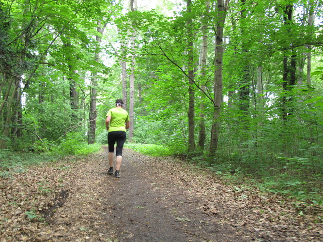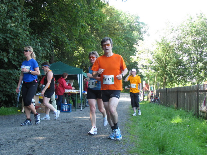 Wir wechseln vom sonnigen Seeufer in ein schattiges Waldstück (km 3). Manchmal sind die Wege recht schmal, manchmal sind sie flach, meist aber geht es rauf oder runter. Es gibt aber (bis jetzt) keine langen oder giftigen Anstiege. Alles spielt sich im gemütlichen, genussvollen Bereich ab. Bei km 5 kommt dann die erste Verpflegungsstelle mit Wasser, Tee, Bananen und Riegeln.