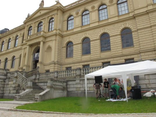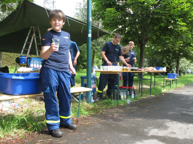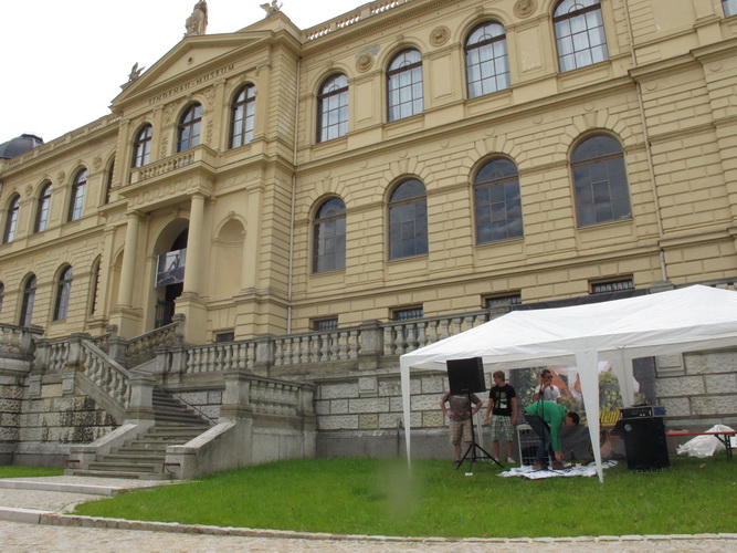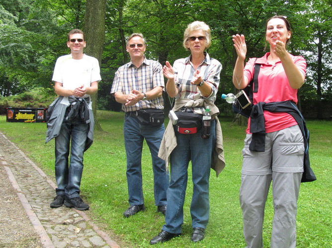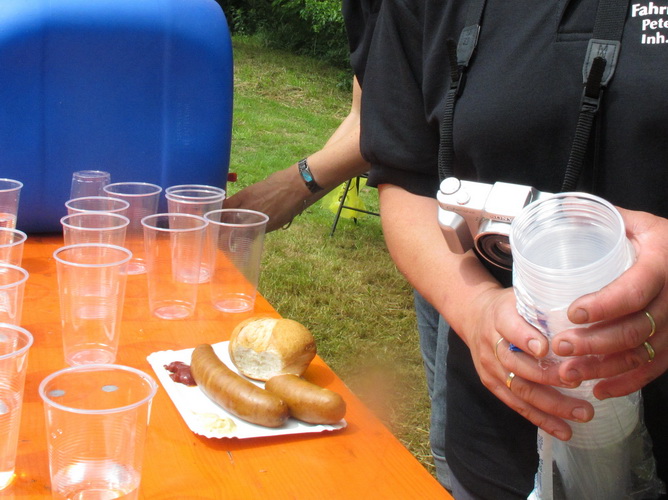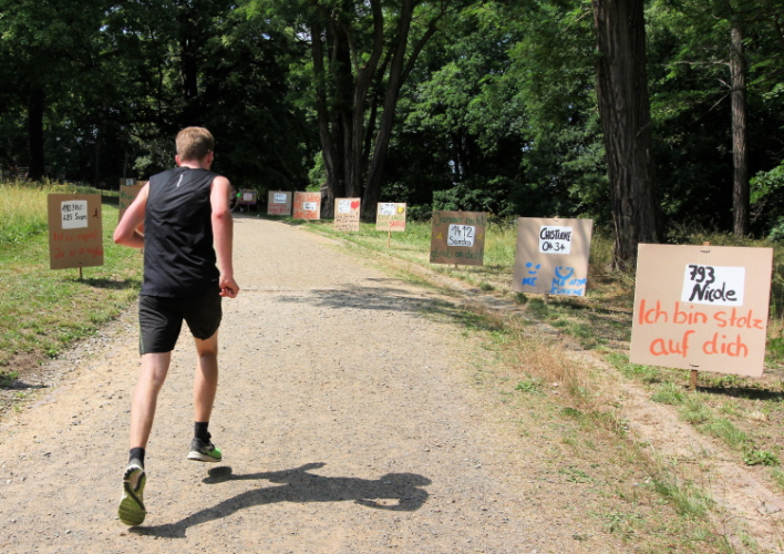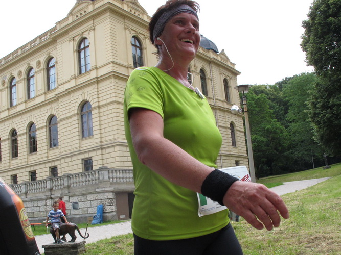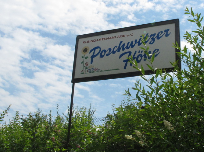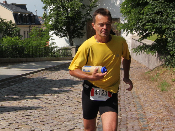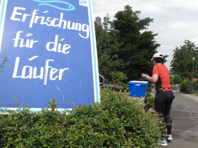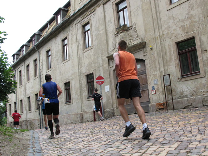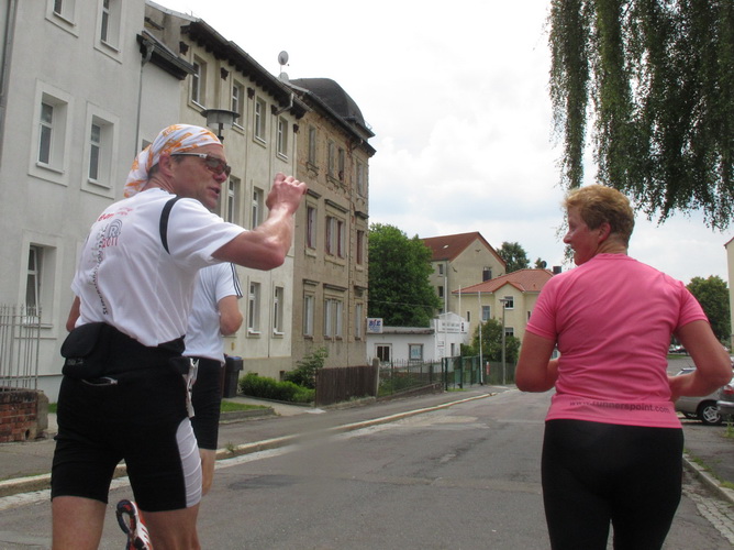 Zwei Kilometer geht es nun bergauf. Nicht steil, auch in meiner Preisklasse wird das im Laufschritt bewältigt. Wir erreichen eine kleine Wohnsiedlung, wo uns einige Bewohner liebevoll empfangen und erfrischen. In einer Wanne steht sogar Eiswasser bereit. Vom Falkenplatz aus ist es nicht weit zum Schloss. Wir entfernen uns aber nordwärts wieder vom Zentrum und erreichen über teils ziemlich rustikale Wege die Datschen auf der Poschwitzer Höhe und ein ganz ansehnliches Gewerbegebiet.