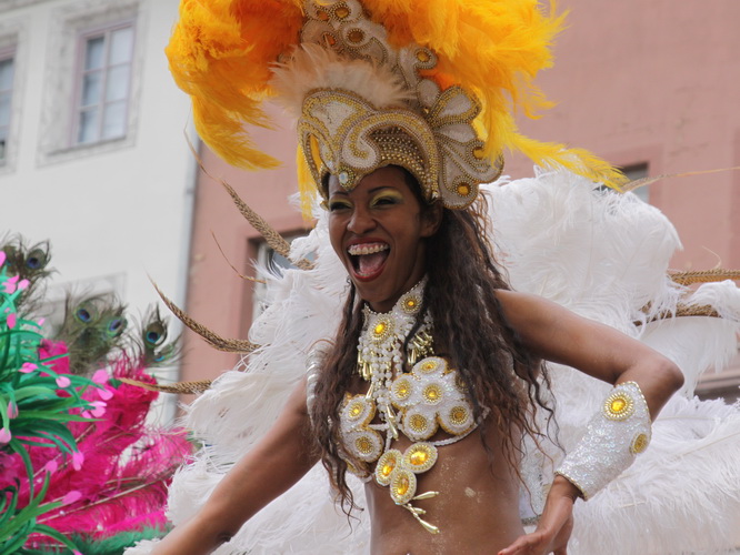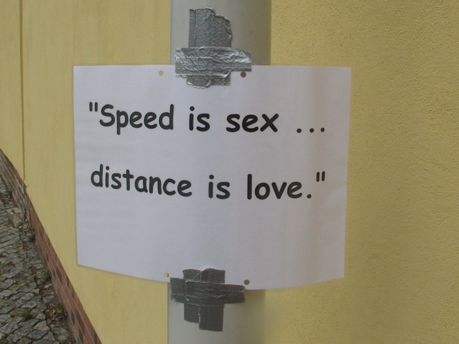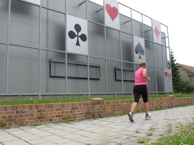 Wir laufen eine kleine Runde durch ein schattiges Waldstück. Ein junges Mädel mit überdimensionierter Sonnenbrille weist uns den Weg. Sie lacht und ich will wissen, was der Grund ist für ihre Heiterkeit. „Ich hab‘ Spaß“, sagt sie. So einfach ist das. Gleich kommt einer angedüst, der hat auch Spaß. Es ist Bodo. „Grüß mir den Anton,“ dann ist er weg. Links sehen wir das moderne Fabrikgebäude der eben erwähnten Spielkartenfabrik, dann wird’s laut.