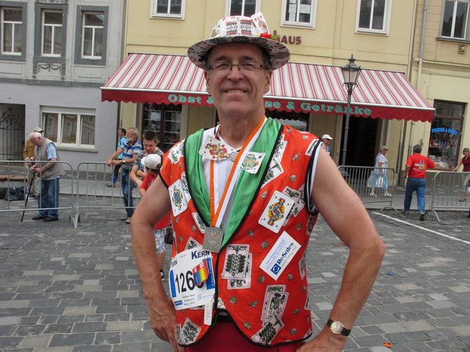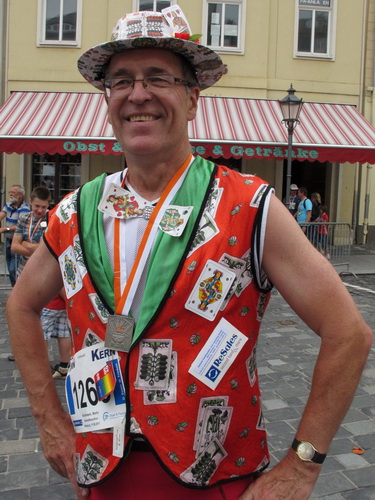 Schlag 10.00 starte ich dann mit dem großen Feld der Halbmarathonläufer und wundere mich - man lässt es relativ ruhig angehen. Schnell wird mir klar warum – es geht gleich zum Roßplan hoch, wo im gleichnamigen Hotel das Skatgericht tagt. Jeder Skatspieler weiß, dass kein Skatabend ohne Diskussion vergeht. Es ist wie beim Fußball. 90 Minuten wird gekickt und 120 Minuten analysiert. Und wie beim Fußball gibt es auch eine richtige Bundesliga mit Meisterschaft, eine Rangliste und jede Menge Kneipen-Turniere. Wenn mal bei einem Streit überhaupt keine Lösung gefunden wird, spricht das Skatgericht das letzte Wort.