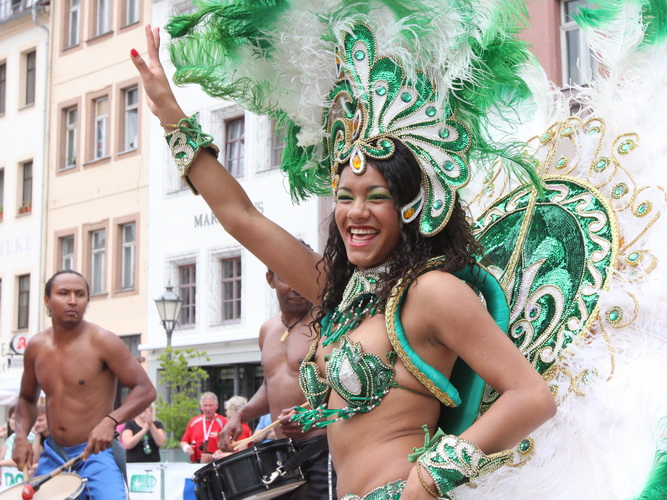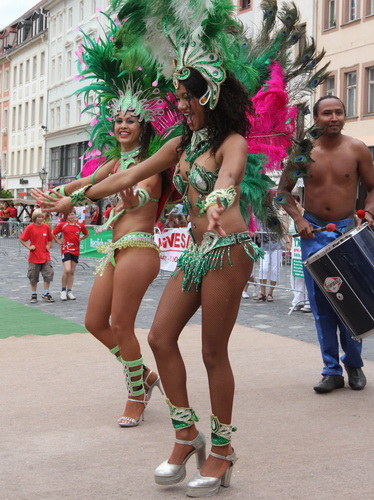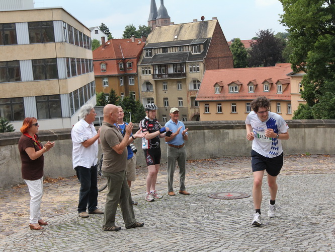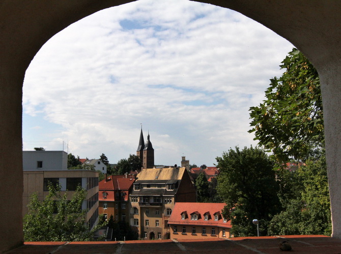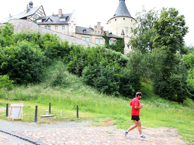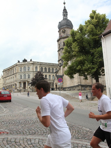 Der nächste Turm ist bei weitem nicht so alt (1845), sieht aus wie ein Campanile, diente aber als reiner Zweckbau der Wasserversorgung. Trommler geben jetzt den Takt vor und etliche Zuschauer verlangen letzten Einsatz. Auf der Wallstraße holen wir Schwung, um zum zweiten Mal den Schlossberg zu erstürmen. Diesmal nehmen wir sozusagen den Haupteingang hinauf zur Schlosskirche (1414). Auf der 1739 erbauten Orgel spielte einst Johann Sebastian Bach.