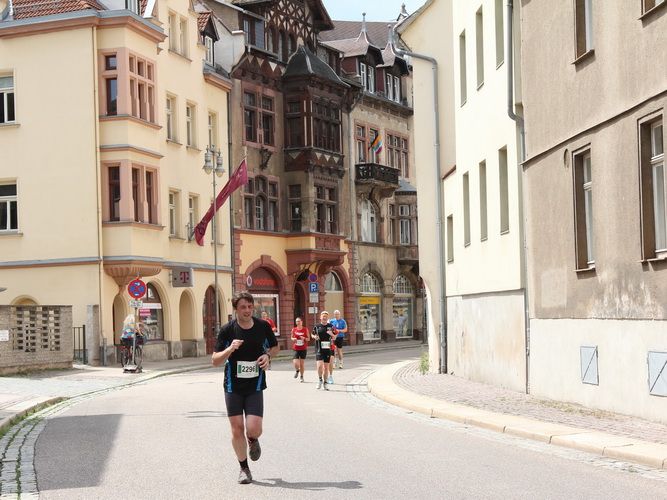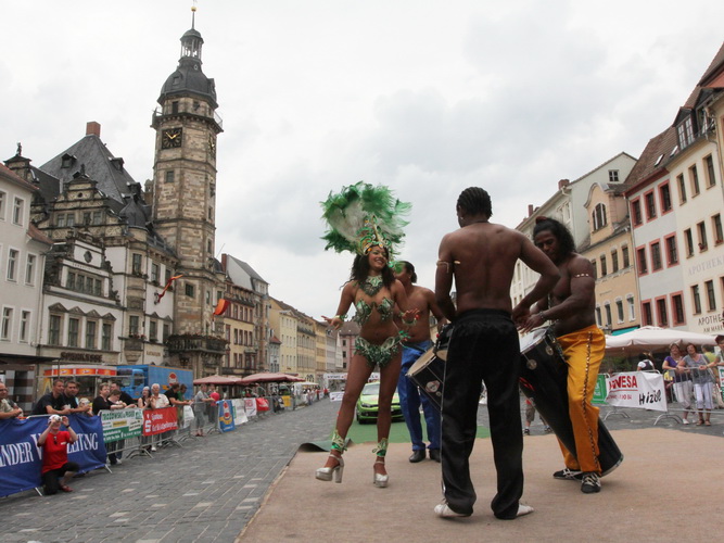 Der Pfingstmontag beginnt mit strahlend blauem Himmel. Ein paar Minuten und ich bin vom Hotel auf dem Start- und Zielgelände am Markt. Der Platz ist eine Augenweide. Wie bei einer Arena gruppieren sich um die langgezogene gepflasterte Fläche historische Gebäude mit prachtvollen, teils bunten Fassaden. Das 1564 erbaute Altenburger Rathaus, dessen achteckiger Turm eine Mondphasenuhr ziert, ist der zentrale Punkt. Das Ende des Platzes markiert die rote Brüderkirche mit dem Mosaik der Bergpredigt.