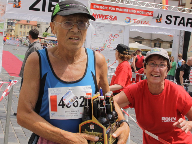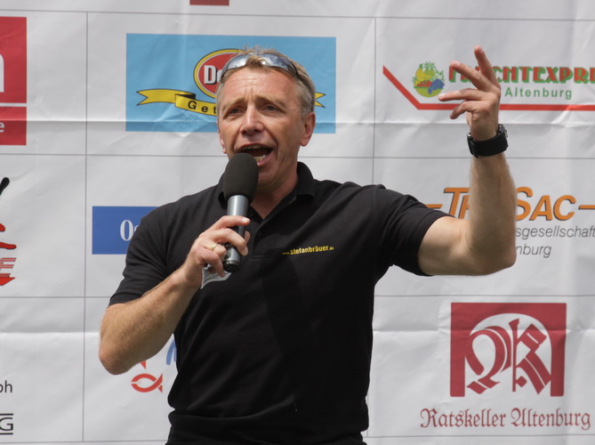 Für eine Veranstaltung in dieser Größenordnung ist das Rahmenprogramm sensationell. Im „Goldenen Pflug“, der Sport- und Kulturhalle in Altenburg, wo es die Startunterlagen gibt, tritt am Vorabend Dieter Baumann auf. Der Andrang ist so groß, dass man schnell die Bestuhlung erweitern muss. Er kommt gut an, der Olympiasieger von der Schwäbischen Alb.