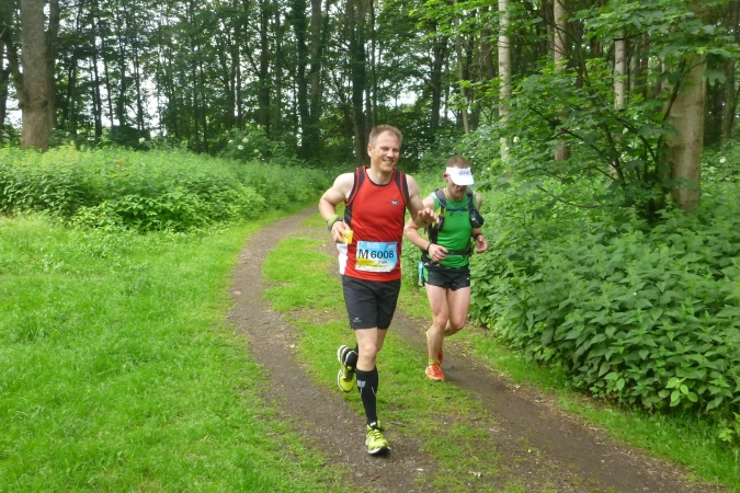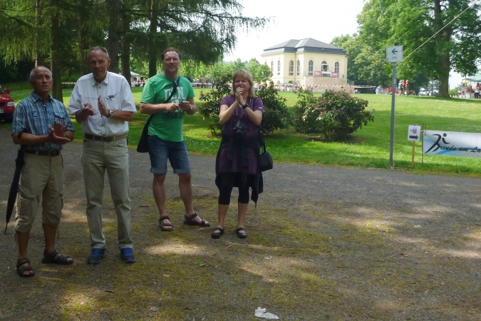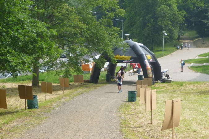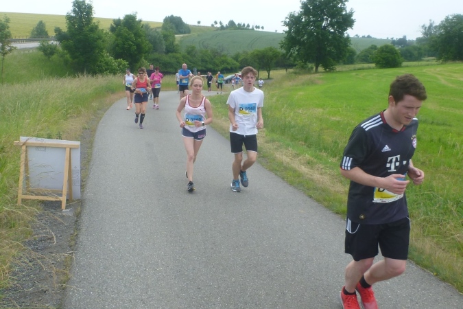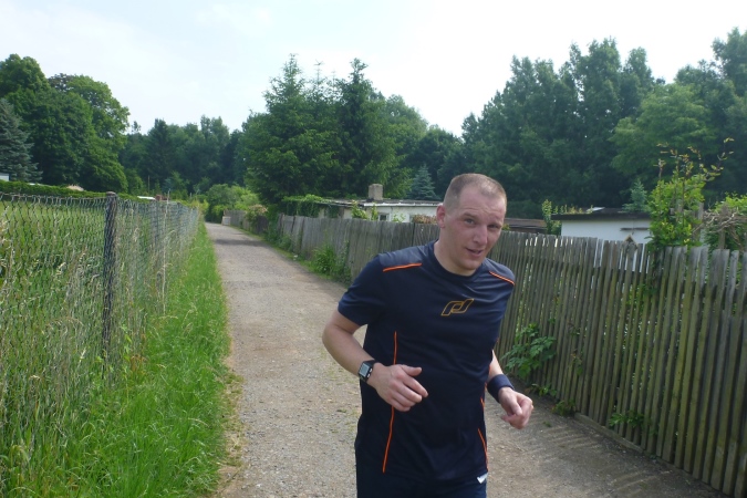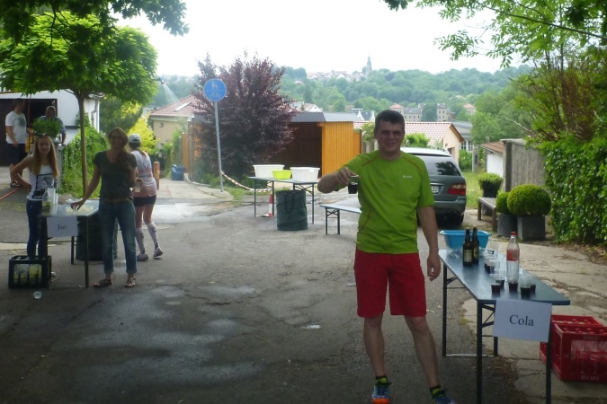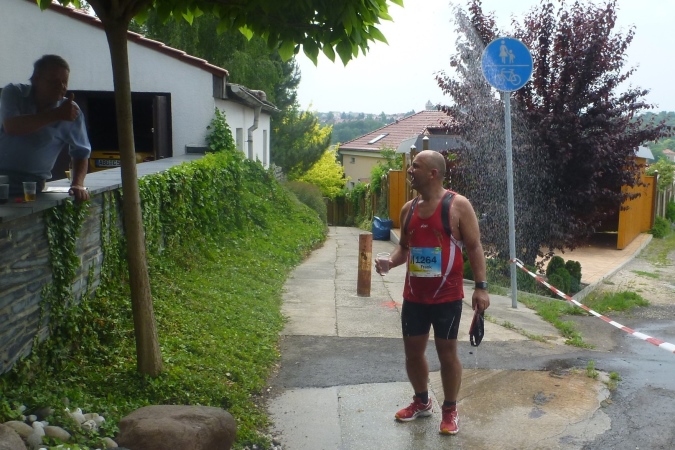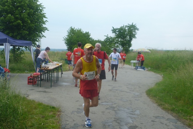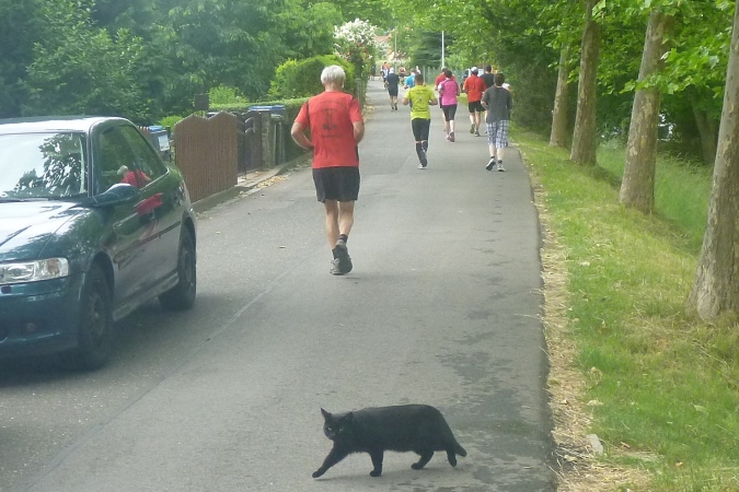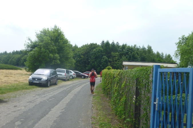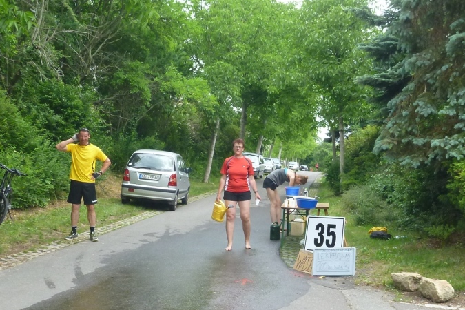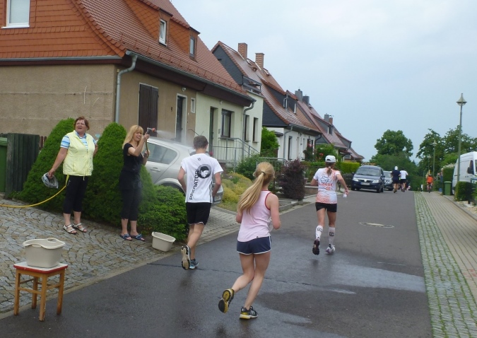 Wenn schwarze Katzen gemächlich den Laufweg kreuzen, weiß man, dass man langsam ist. Die private Verpflegungsstelle im Anstieg zur Poschwitzer Höhe nutze ich zu einer Rückenbehandlung aus der Gießkanne. Furchtbar kalt. Wieder so ein Tipp von Herbert: Warum trinken und schwitzen, wenn man die kühlende Feuchtigkeit auch von außen auf Hemd und Haut bringen kann? Schon logisch. Nicht bedacht hatte ich hingegen, dass mir das Wasser jetzt in den Schuhen steht. Aber egal, es sind „nur“ noch 7 Kilometer. Ich beglückwünsche die Streckenposten am Teich zu ihrem schattigen, kühlen Kontrollplätzchen. Die Feuerwehrler haben sich in ihre Basis verzogen. Die wissen wahrscheinlich schon, was auf sie zukommt. Es braut sich nämlich ein Gewitter zusammen. Ich genieße noch einmal ausgiebig die Verpflegungsstelle mit Aussicht. Ein Läufer nimmt eine Dusche. Als ich mich zum Weitermachen aufraffe, ist Judith deutlich voraus. Die wird es doch nicht wagen, mich abzuhängen? Langsam kämpfe ich mich heran. Ich als großer Berglaufmeister werde sie schon wieder einfangen.