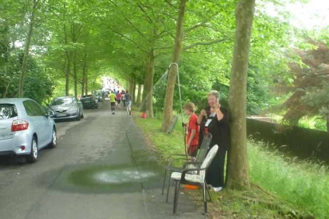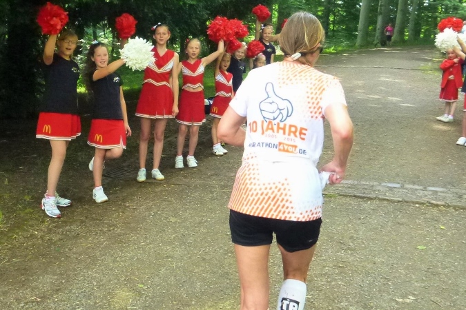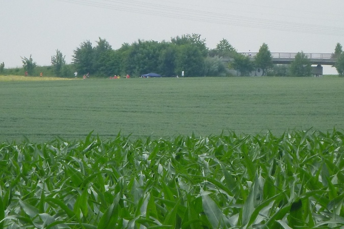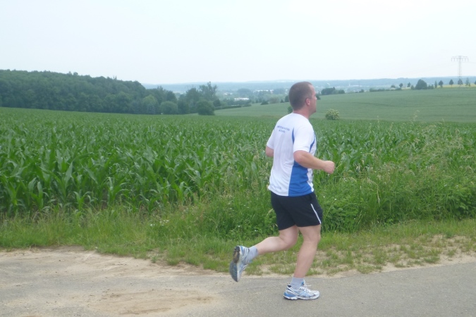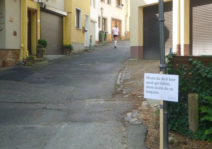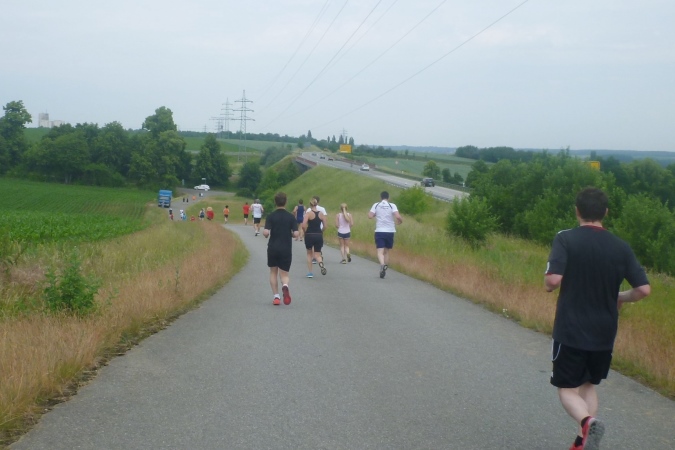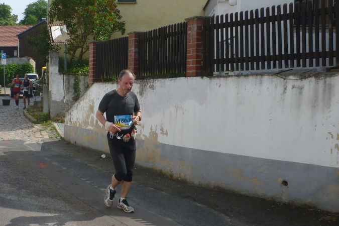 Kurz vor dem „Höhepunkt“ an der B93 erscheint eine größere Läuferschar direkt vor uns. Womöglich die Marathon-Spitzengruppe, die wir im Begriff sind einzuholen? Leider nein, es sind die 13,3-km-Sportler, die uns ab hier ein Stück weit begleiten. Dazu muss auch Herbert Steffny mit einem kleinen Läufertrupp gehören, den wir aber leider nirgends erkennen können. Immerhin haben wir nun neue Mitstreiter und viele frühzeitig ausgepowerte unfreiwillige „Geher“ zu überholen. Wobei wir uns leider auch oft solidarisieren und mitmarschieren. Es ist einfach zu heiß und zu steil.