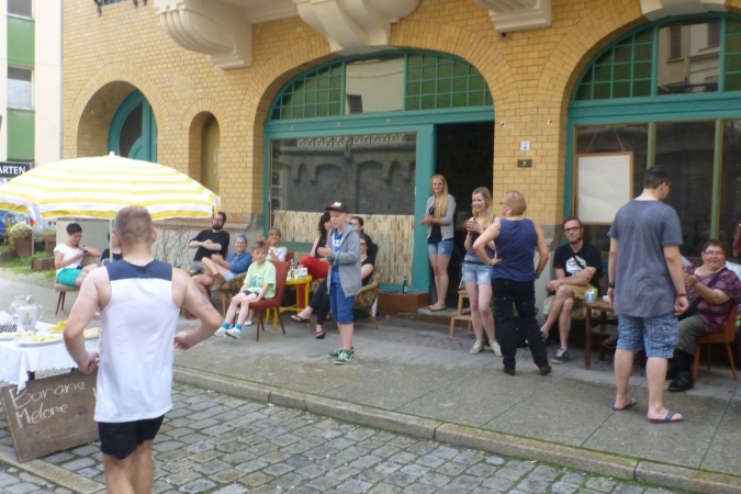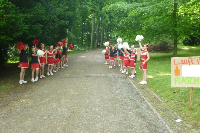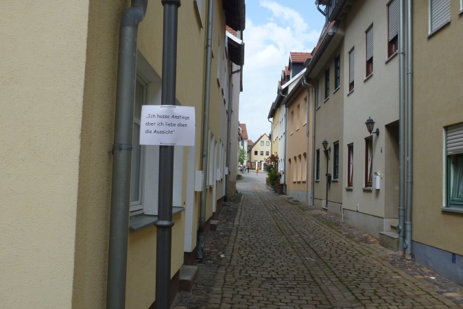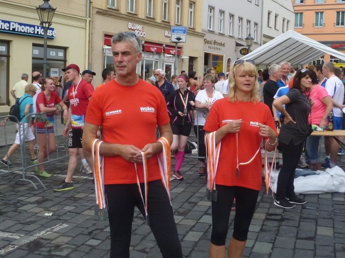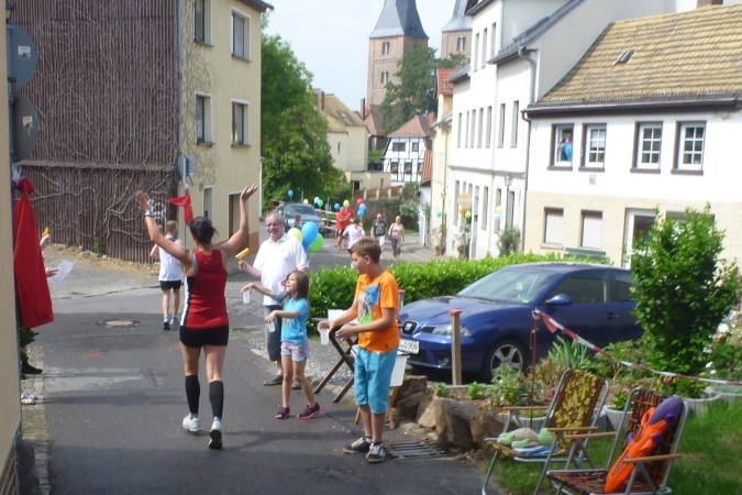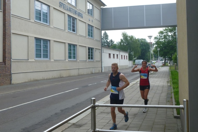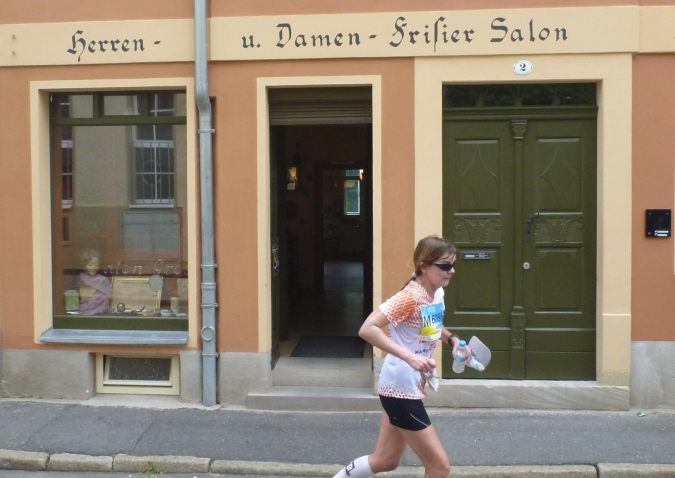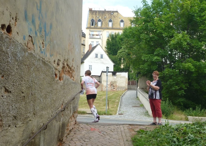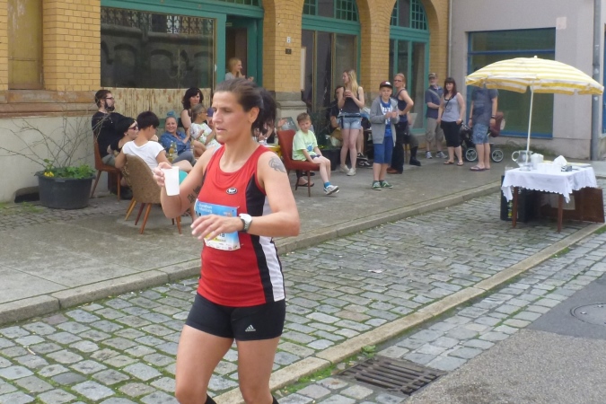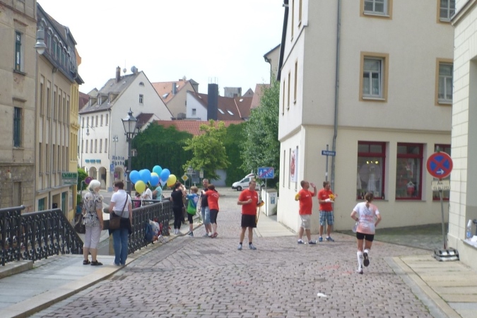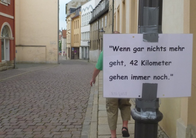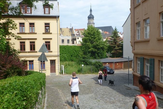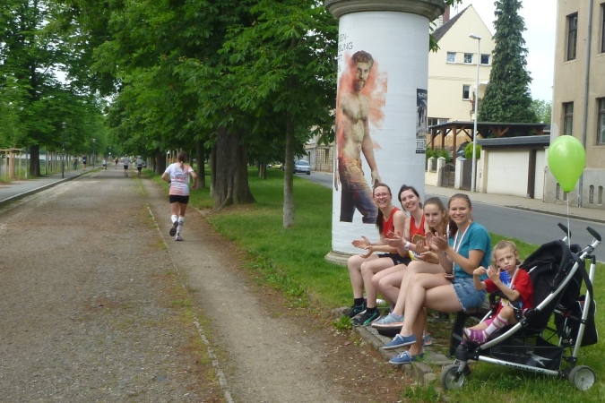 Hinter dem Gebäude des Lindenau-Museums geht es steil bergauf. Viele Transparente, von Unterstützern der Teilnehmer auf der Marathonmesse gefertigt, verbreiten Durchhalteparolen wie „Nach der Qual ein Bier nach Wahl“. Trommelgruppe und Cheerleader geben ihr Bestes. Und auch der Marathon4you-Chef und seine Frau feuern an. Wir sind auf dem Schlossberg. Vor der Orangerie ein Kinderfest im Rahmen des Lauftags. Dann durch die schmale Jungferngasse nach unten und sofort wieder bergauf. Meinen Tipp, hier doch eine große Fußgängerbrücke zu bauen, um sich das Auf und Ab zu sparen, kommentiert niemand. Dafür lernen wir Sina und Silvio vom SV Lerchenberg Altenburg kennen. Sina kommt direkt an ihrer Wohnung vorbei. Der Ehemann winkt vom Balkon.