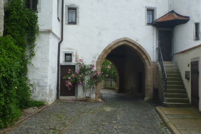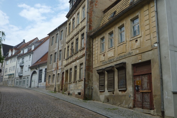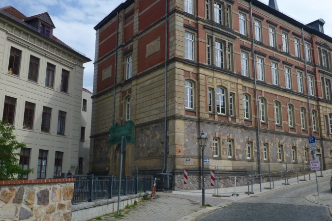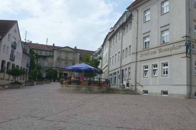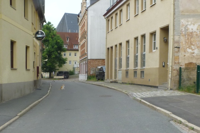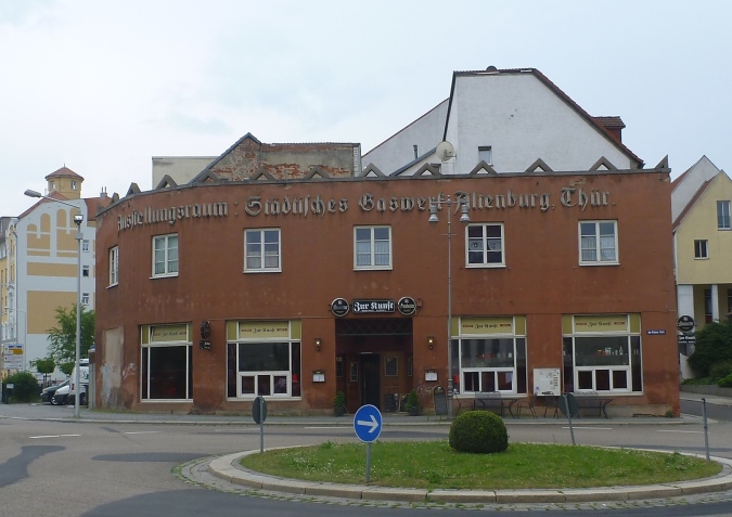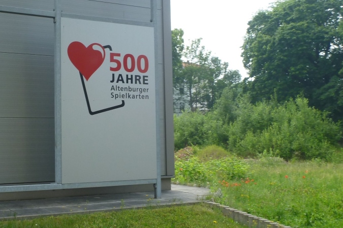 Zwischen den Gebäuden der Spielkartenfabrik ASS Altenburg hindurch. Hier findet sich auch die Lösung der Fahnenfrage am Rathaus: In der Skatstadt werden schon seit 1509 Spielkarten produziert, wenigstens sind aus dieser Zeit noch Karten erhalten. Die Altenburg-Stralsunder Spielkartenfabrik war auch schon zu DDR-Zeiten im Westen ein Begriff. Allerdings wohl eher wegen der Produkte des in Leinfelden bei Stuttgart ansässigen „Ablegers“.