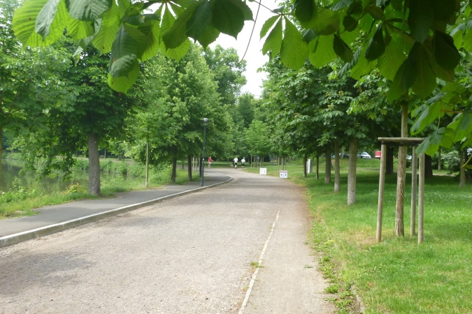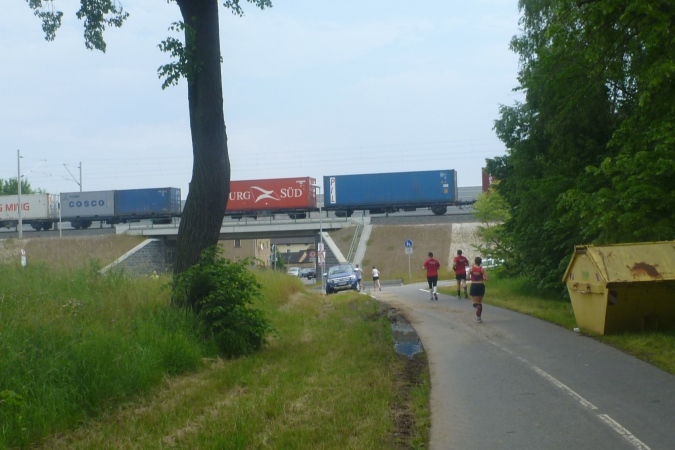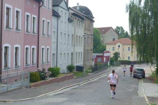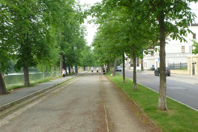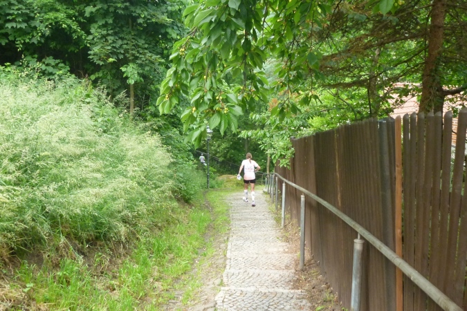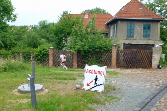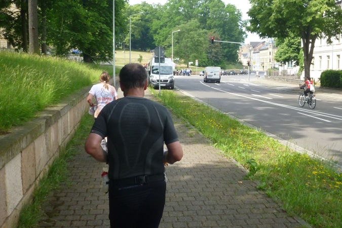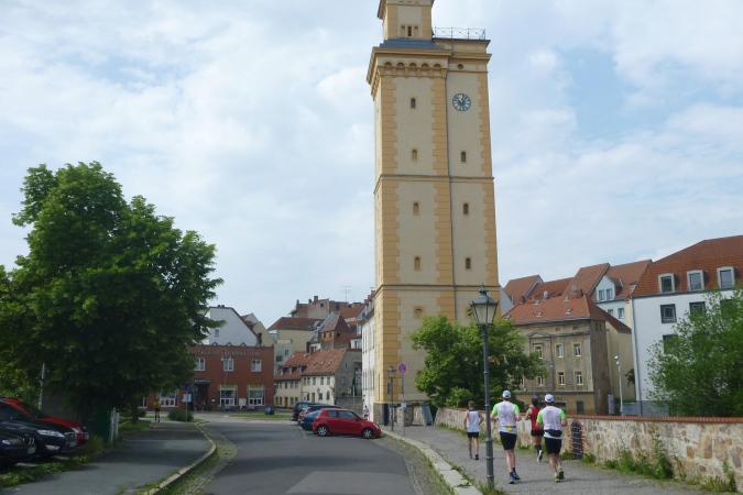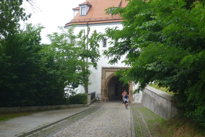 Das Silo ist bald erreicht, eine kleine Schleife durch den wunderbar verträumten Poschwitzer Park mit einem Tümpel folgt. Personenkontrolle. Kurz danach der Hinweis auf das Tierheim und die Anlage von Südost-Fleisch. Beide haben aber, wie sich gleich herausstellt, nichts miteinander zu tun. Wir sind „Am weißen Berg“, doch es ist hier recht flach. Ein winziges Stückchen Industrie, Feuerwache, Kleingartenanlage und dann mein persönliches Highlight: Wie aus dem Nichts öffnet sich am 15,8-km-Verpflegungspunkt der Blick auf die Türme der Altstadt. Wunderbar. Trinken und Schauen. Dann schnurstracks nach unten.