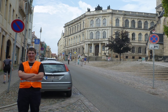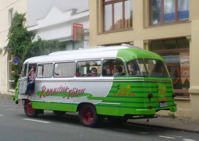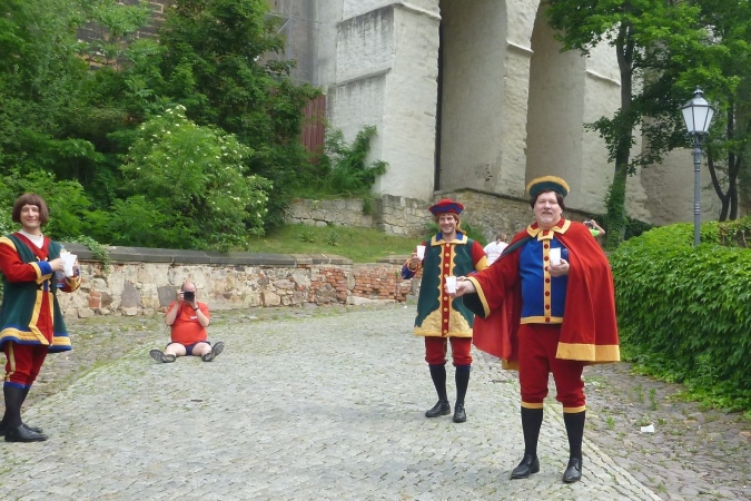 Jetzt jagt eine Sehenswürdigkeit die nächste. Vor dem Café im Paul-Gustavus-Haus mit seiner skurrilen 50er-Jahre-Einrichtung viel Remmidemmi. Ein privater Förderverein kümmert sich um die Renovierung des Ensembles. Der nächste Turm gehört der ehemaligen Postdirektion (zu vermieten). Links am Landestheater vorbei. Es wurde bis 1871 von Otto Brückwald erbaut, der nach den Vorstellungen von Richard Wagner und Vorschlägen Gottfried Sempers auch das Bayreuther Festspielhaus errichtete. Vor uns das Schloss, seit 976 auf einem Felsen aus purpurnem Stein (Porphyr) entstanden und ehemalige Residenz der Herzöge von Sachsen-Altenburg. Am Aufstieg stehen drei Buben in Kostümen, wie man sie von Spielkarten her kennt. Der vierte fehlt, er ist wohl oben im Spielkartenmuseum.