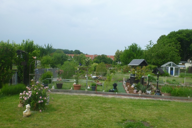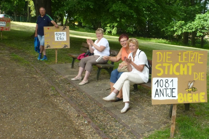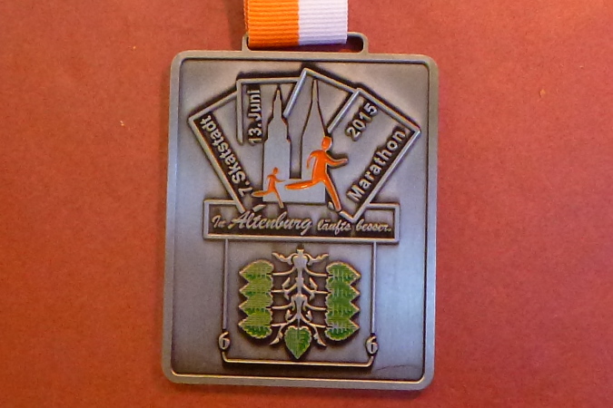 An jubelnden Zuschauern vorbei geht es Richtung Brüderkirche, erbaut 1905 in Jugendstil und Neobacksteingotik. Kurz vor dem Zieltor gibt es schon eine Rose für Judith und die gleichzeitig mit uns eintreffenden Walkerinnen. Außerdem erwartet uns als Lohn der viereinhalb Stunden währenden Anstrengung je eine Spielkarten-Sammelmedaille. Sie trägt in diesem Jahr das Grün-, Gras- oder Laub-Motiv mit (wenn ich das richtig deute) dem Wert Neun.„ „Ach du grüne Neune“, kann man da nur ausrufen. Wer abergläubisch ist und sich die Karten legen lässt, dem verheißt dieses Blatt nichts Gutes. Bleibt zu hoffen, dass der aufgeprägte Slogan „In Altenburg läuft`s besser“ einen positiven Ausgleich dazu schafft.