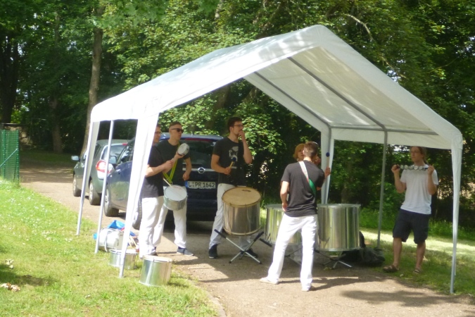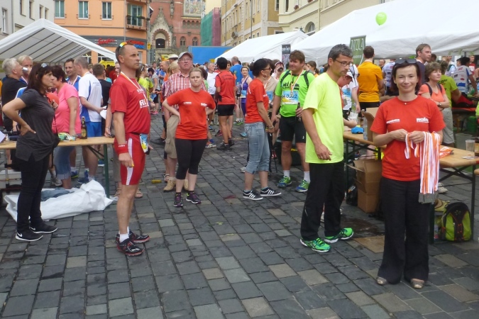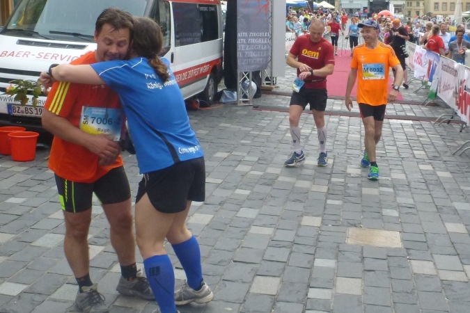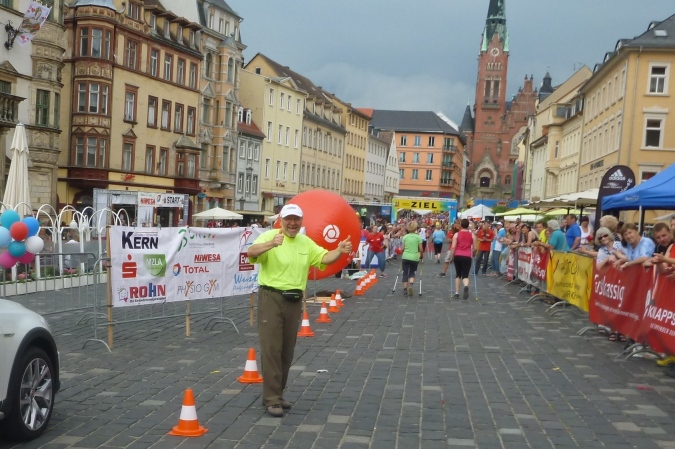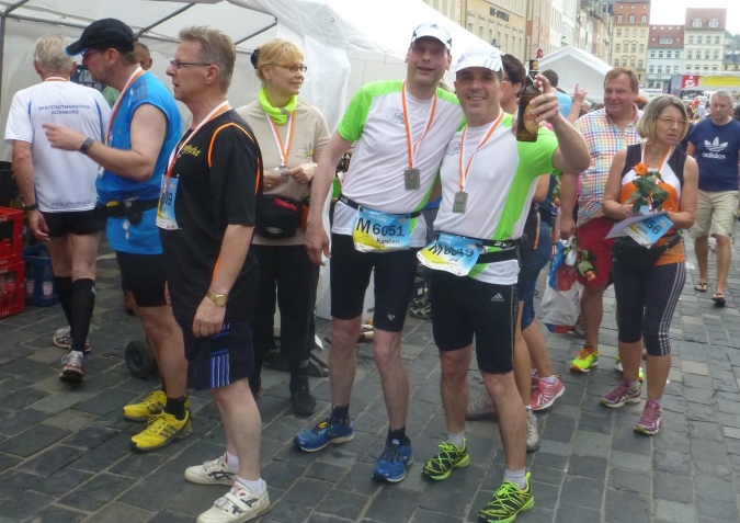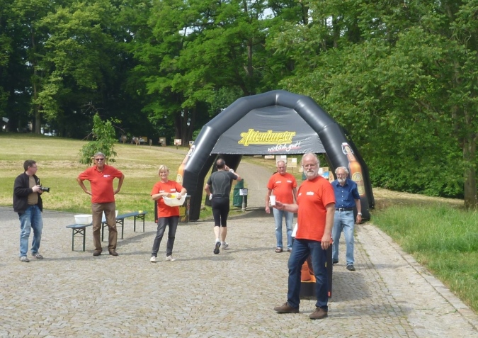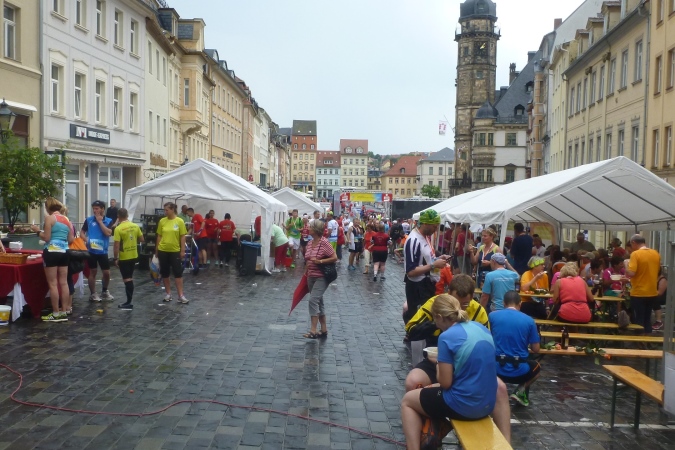 Übrigens besitzen viele Teilnehmer schon alle sieben Karten der bisherigen Skatstadt-Marathons. Wir fachsimpeln noch eine Weile mit unseren Mitstreitern. Die Brauerei Altenburg hat zwecks Zielverpflegung ihr gesamtes Sortiment aufgefahren, und die Gulaschkanone beschert uns einen großen Teller Kartoffelsuppe. Auf einmal spritzt es in meinem Teller. Da hilft nur die Flucht unter das nächste Zeltdach, denn augenblicklich prasselt ein kräftiger Hagelschauer hernieder. Immer noch kommen Sportler ins Ziel. Ich höre, dass der Regen bei dieser Veranstaltung auch Tradition hat. Aber schon bald strahlt wieder die Sonne.