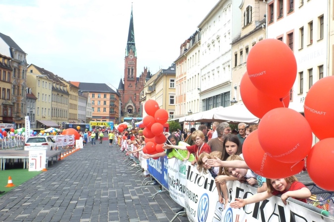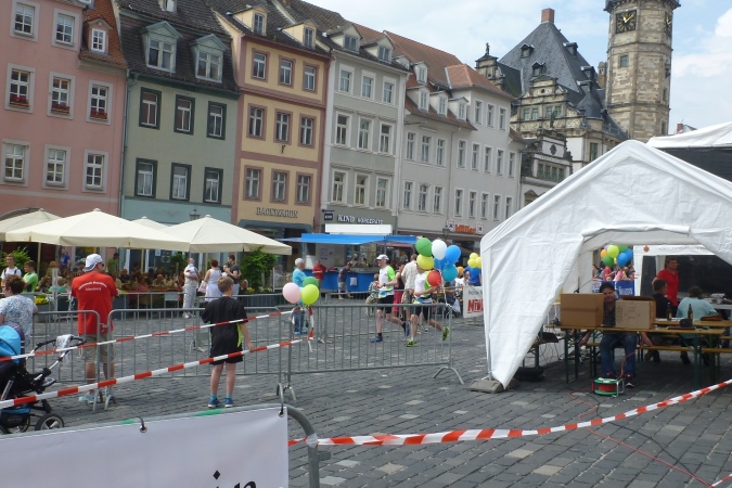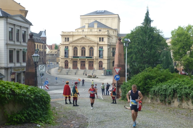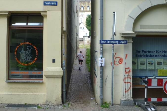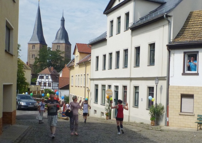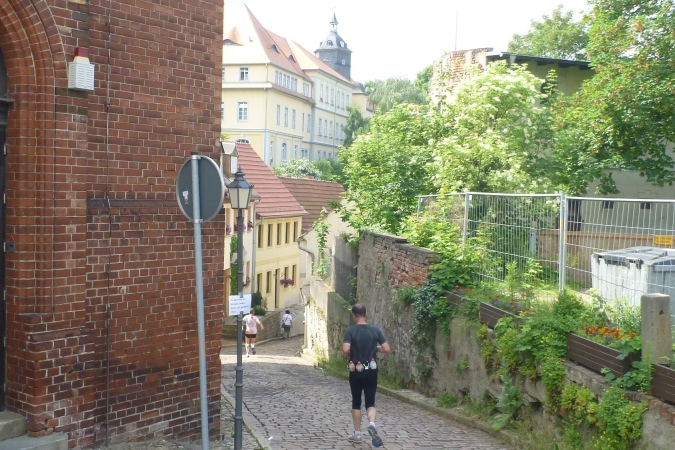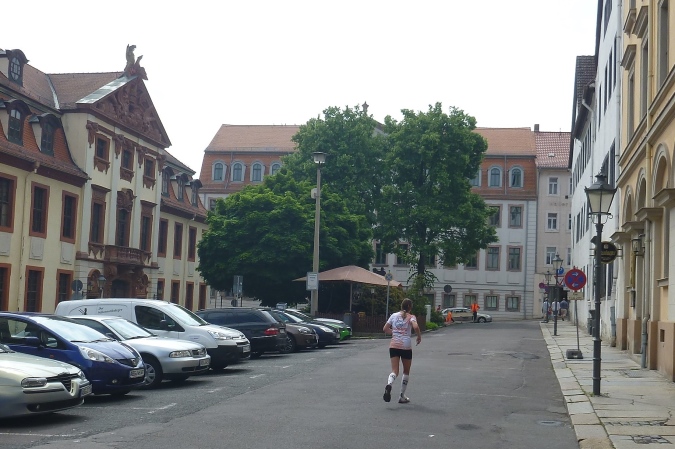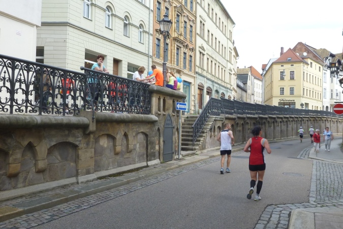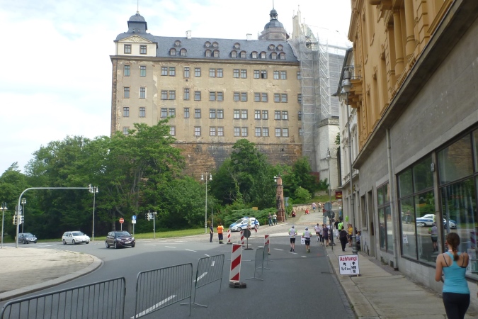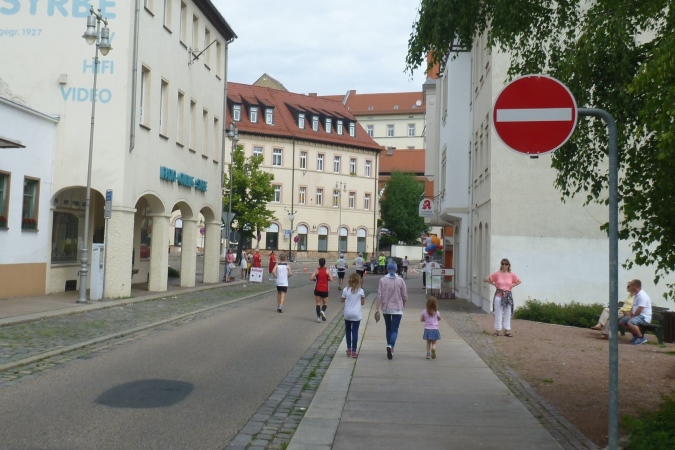 Die Schlosskirche wird gerade renoviert. Durch das Triumphtor hinein in die Anlage. Vor dem Burgplatz geht’s schon wieder rechts durch das Torhaus hinaus. Folgerichtig auch wieder nach unten. Querung der Rosa-Luxemburg-Straße, in die schmale Glockengasse, über den Brühl, einen Haken und dann der Zielbereich am Markt: Hier ist natürlich die Hölle los, zumal ja auch noch andere Laufwettbewerbe über kürzere Strecken hier enden. Diverse Bands und etliche Zuschauer konzentrieren sich in diesem Bereich. Kurz vor dem Ziel geht es auf die zweite Runde. Ich freue mich schon darauf, meine vorherigen Eindrücke zu vertiefen.