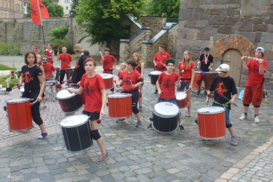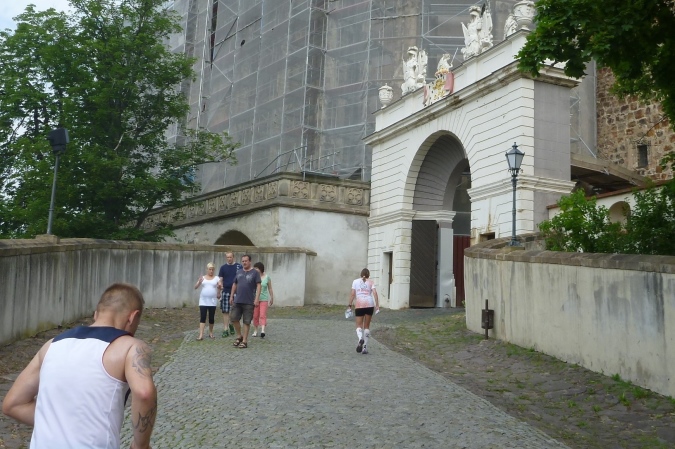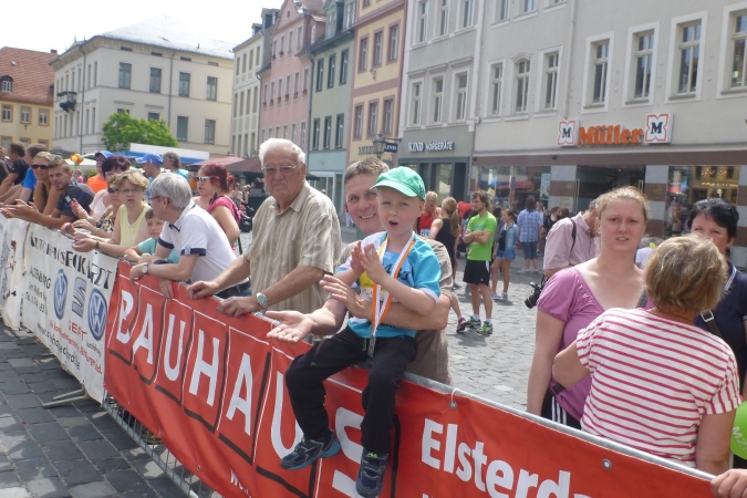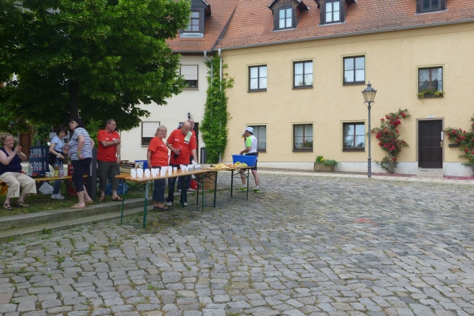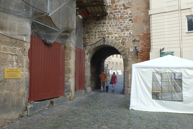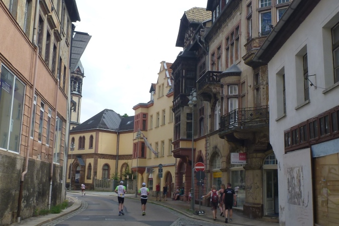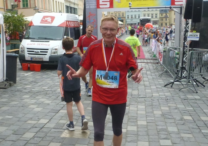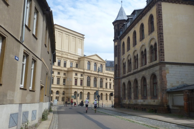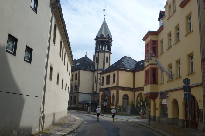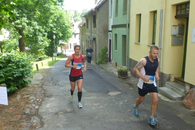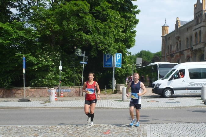 Die Schlosskirche wird gerade renoviert. Durch das Triumphtor hinein in die Anlage. Vor dem Burgplatz geht’s schon wieder rechts durch das Torhaus hinaus. Folgerichtig auch wieder nach unten. Querung der Rosa-Luxemburg-Straße, in die schmale Glockengasse, über den Brühl, einen Haken und dann der Zielbereich am Markt: Hier ist natürlich die Hölle los, zumal ja auch noch andere Laufwettbewerbe über kürzere Strecken hier enden. Diverse Bands und etliche Zuschauer konzentrieren sich in diesem Bereich. Kurz vor dem Ziel geht es auf die zweite Runde. Ich freue mich schon darauf, meine vorherigen Eindrücke zu vertiefen.