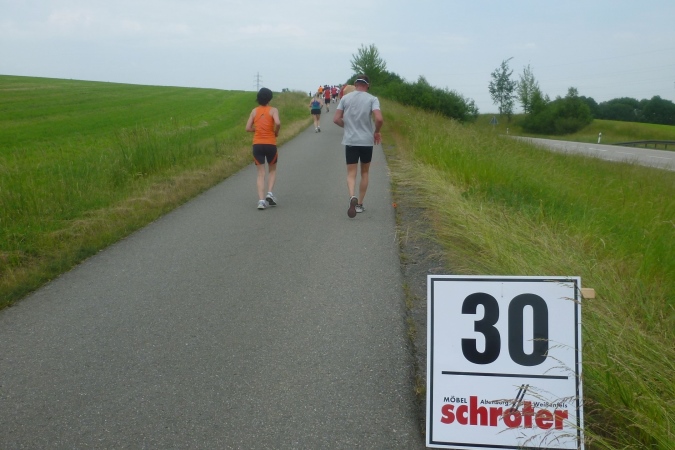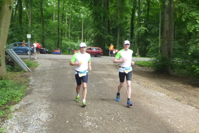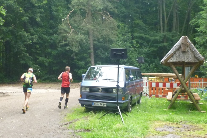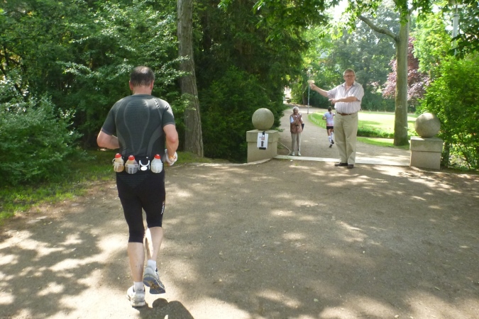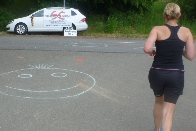 Die zahlreichen Verpflegungsstellen sind nach wie vor bestens bestückt. Vielerlei Obst, Riegel, Kekse, Wasser, Apfelschorle und Iso von Anfang an. Auch Altenburger Dunkelbier (mit Alkohol) weirden angeboten; ein Standbetreuer ermahnt seinen Kollegen, die Läufer nur ja auf den Unterschied zum gleichfarbigen Colagetränk hinzuweisen. Cola würde mich reizen. Aber Herbert Steffny hatte uns gestern gewarnt, dass die aufmunternde Wirkung des Koffeins nur kurz anhältund daher erst ab km 35 empfohlen. Ich probiere lieber seinen Tipp mit der Salzprise im Iso-Drink. Salz gibt es nämlich auch. Und natürlich warten an einigen Stellen die bekannten blauen Häuschen.