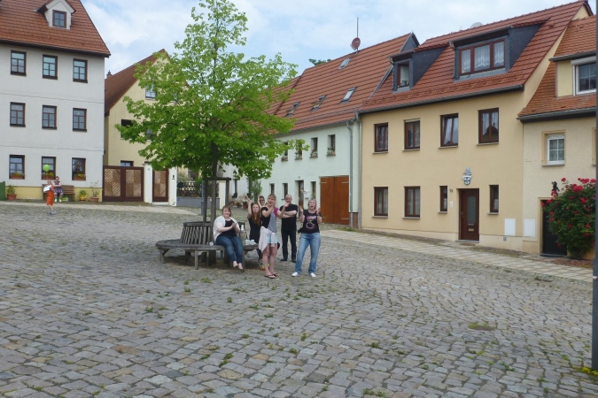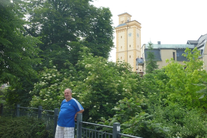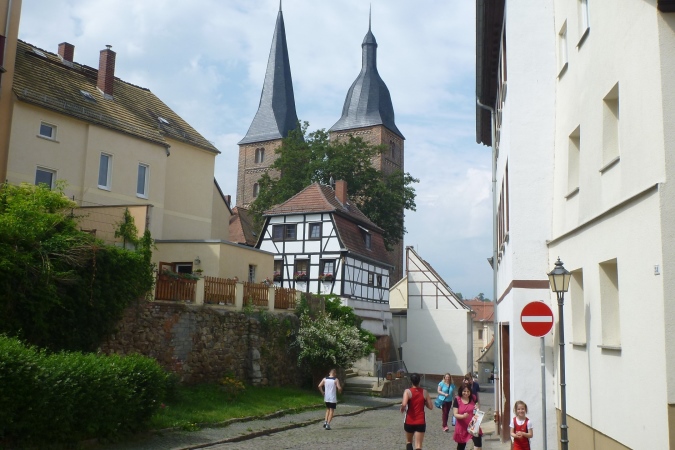 Vor uns die Roten Spitzen: Die beiden unterschiedlich gestalteten Backsteintürme sind das Wahrzeichen Altenburgs und gehörten einst zur Marienkirche der Augustiner-Chorherren. Sie soll von Friedrich Barbarossa geweiht worden sein. Dann am Kunstturm vorbei, einem 1845 errichteten Wasserturm.