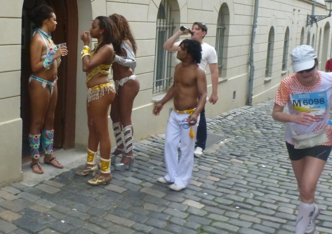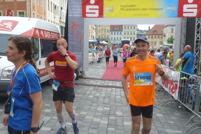 Der Rennsteig-Express-Bus bietet mir eine Mitfahrt an. Aha, jetzt fällt es mir ein: Der beliebteste Marathon nicht nur in Thüringen, sondern im gesamten deutschsprachigen Raum, ist ja der Rennsteiglauf. Schon wieder gähnt uns eine Katze an. Ganz schön frech. Das anstrengende Auf und Ab aus der Endphase der ersten Runde wiederholt sich. Kurz vor dem Markt sehe ich leicht bekleidete brasilianische Schönheiten entschwinden. Keine Halluzination: Da haben wir wohl eine Tanzvorführung verpasst.