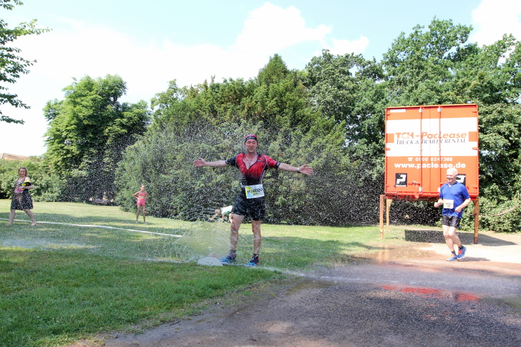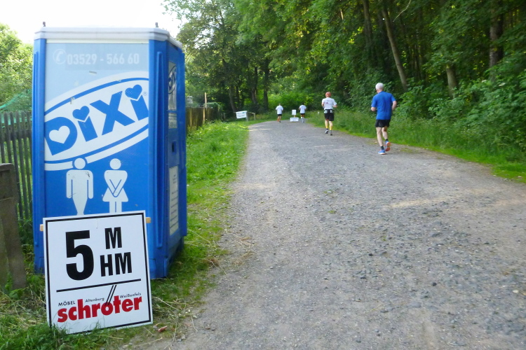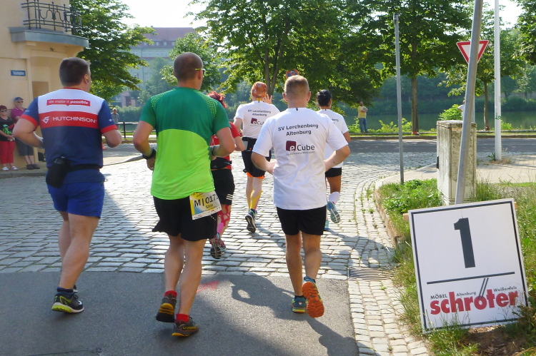 Damit die Streckenlänge passt, ist noch eine kurze Wendestrecke (rund 100 Meter lang) eingebaut. Wir erreichen die Mozartstraße nach einen ruppigen Wiesenüberquerung. Karsten und Jörg machen mir Platz, als ich von hinten auflaufe. Sie kommen vom Klinikum Altenburger Land, das eine starke Mannschaft am Start hat. Es geht nun zur ASS Spielkartenfabrik hinunter. Ein Anwohner hat eine Gartendusche am Straßenrand aufgestellt, wir Läufer stellen uns gerne drunter.