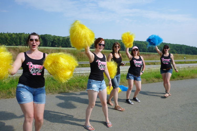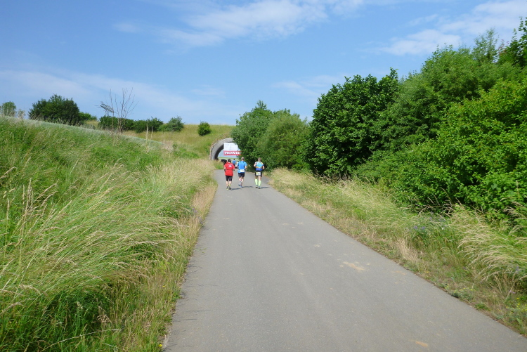 Auf der Paditzer Straße laufen wir nun auf die Stadtumgehung zu, überqueren diese und kommen an eine Trinkstelle (7,5 Kilometer) mit ein paar Cheerleader Girls, die sich ebenfalls ins Rampenlicht drängen. Gut zwei Kilometer führt der Kurs parallel zur Stadtumgehung, nur einmal unterbrochen, als wir mittels einer Unterführung auf die Ostseite der Hauptstraße wechseln, natürlich mit einer zarten Steigung in praller Sonne. Wer hat Sonnenschutz aufgetragen? Ich nicht, dafür wird mir später die Birne brennen.