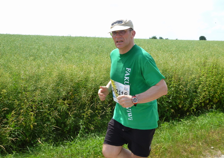 Wir überqueren zwei mustergültig abgesperrte Straßen, laufen durch einen Spielplatz und dann sehe ich schon, dass der Stadtwald endet. Wir verlassen den bequemen Waldweg und biegen auf einen thüringisch-rustikalen Feldweg ein, bergauf! Ein Marathon light schaut anders aus. Dafür ist das Gras auf dem Weg gemäht, die Zecken dürfen sich andere Opfer suchen. Bodo drängelt sich vor meine Blende. Er führt eine Gruppe von vier, fünf Marathonis an. Der Bodo ist halt eine Rampensau, meint ein Freund aus seiner Gruppe. Wir lachen.