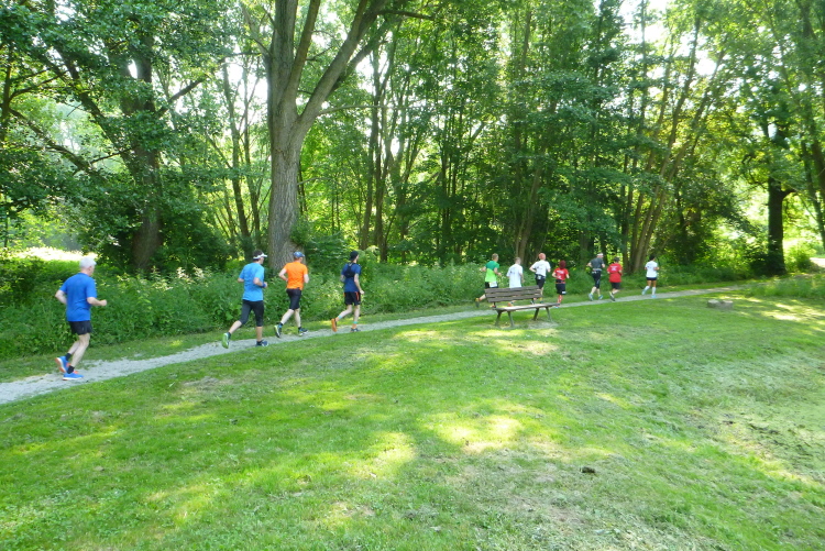 Am Ende des Teiches sehe ich die erste Streckentrennung, wir werden von den Sparkassenmädels eingewiesen. Wir können es nun die paar flachen Meter bis zur Hellwiese laufen lassen. In der Kleingartenanlage ist noch kein Mensch zu sehen. Kurz vor dem Märchenbrunnen ist der zweite Kilometer geschafft. Wir wenden in Sichtkontakt und laufen zum Großen Teich zurück, wo abermals eine Streckentrennung ist. Wir müssen nun rechts abbiegen.
