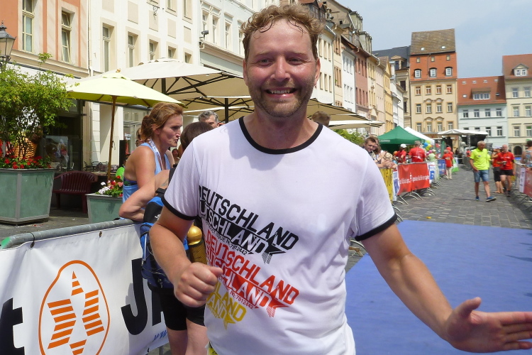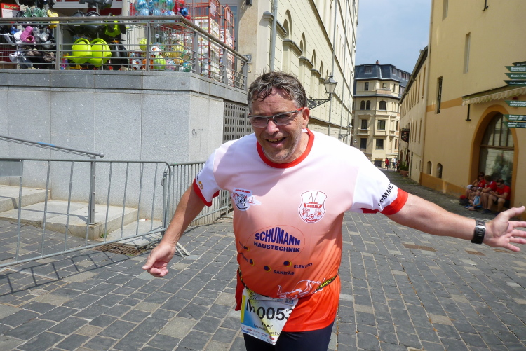 „Eine infernalische Reise“, so heißt laut Transparent die nächste Aufführung im Theater . Der letzte Anstieg hoch zum Schloss gerät auch für mich zum Inferno. Mit Mühe und Not komme ich im Schlappschritt rauf. Dann kann ich den letzten Kilometer durch die Innenstadt genießen. Die Anspannung löst sich, ja, sie fällt ab, als ich die Marktgasse hoch auf dem Markt laufe und Stefan Bräuer mich ankündigt und abklatscht. Die Zeit ist mir egal. Knapp 4.30 Stunden. Man hängt mir die Medaille um.