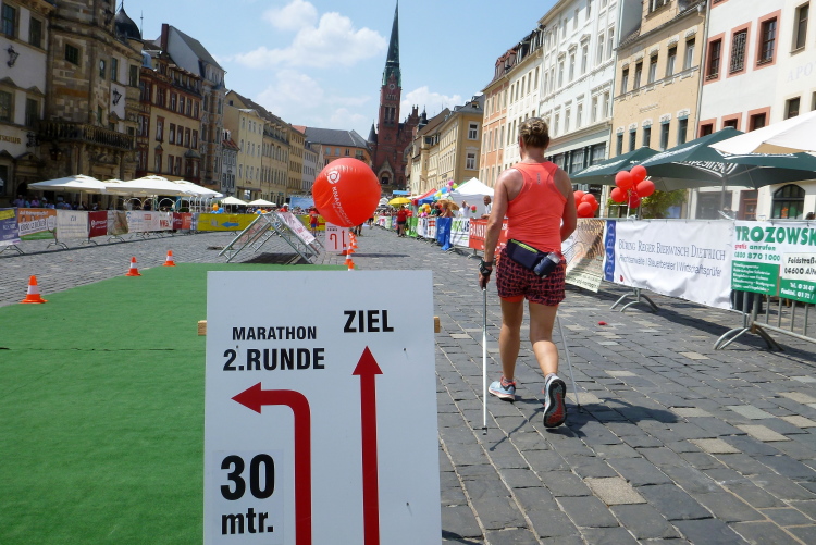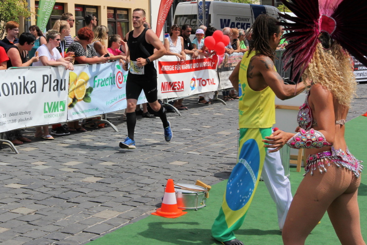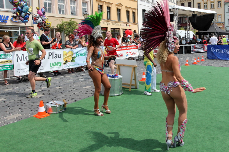 Jetzt geht es Schlag auf Schlag: Der Skatbrunnen am Brühl, rechterhand die St. Bartholomä-Kirche, dann geht es die Marktgasse hinauf, wo uns Helfer in ihren roten Shirts erwarten und anfeuern. Seit geraumer Zeit hören wir Stefan Bräuer und die Musik, dann sehe ich die Wende. Die erste Etappe ist geschafft und ich bin jetzt schon platt. Die Zeit spielt eh keine Rolle mehr. Ich schäkere ein wenig mit der Sambatänzerin herum und mache mich dann auf in die zweite Runde.