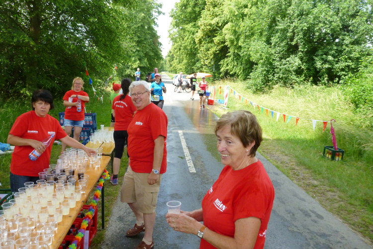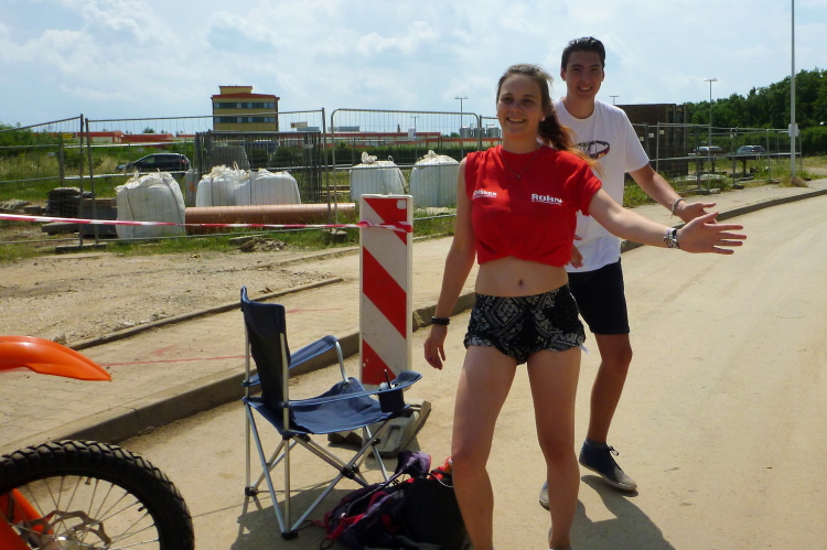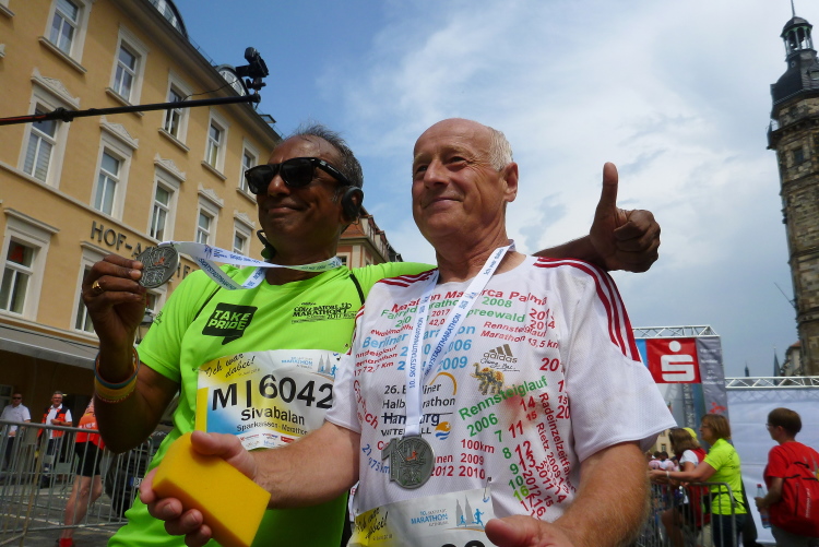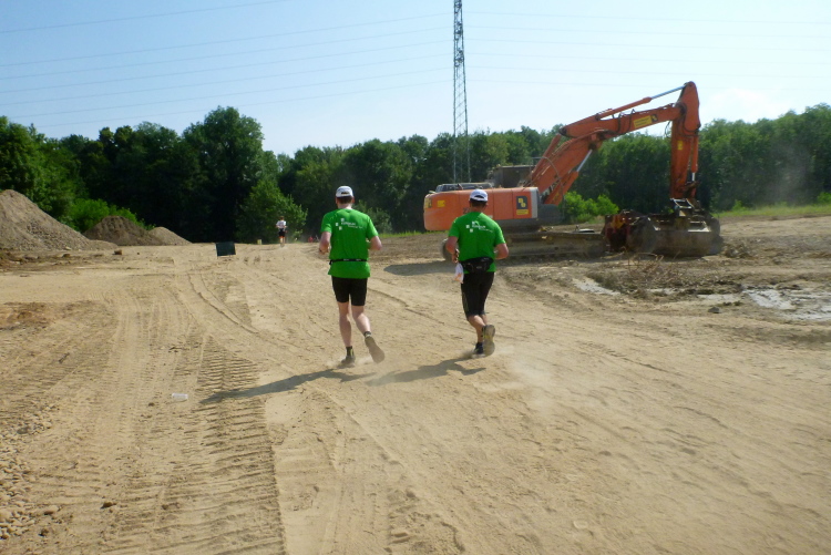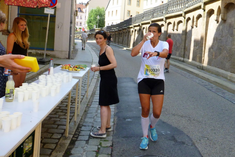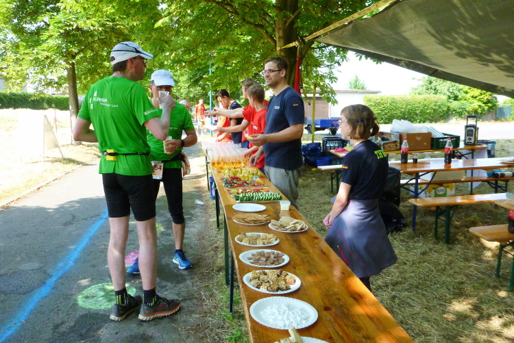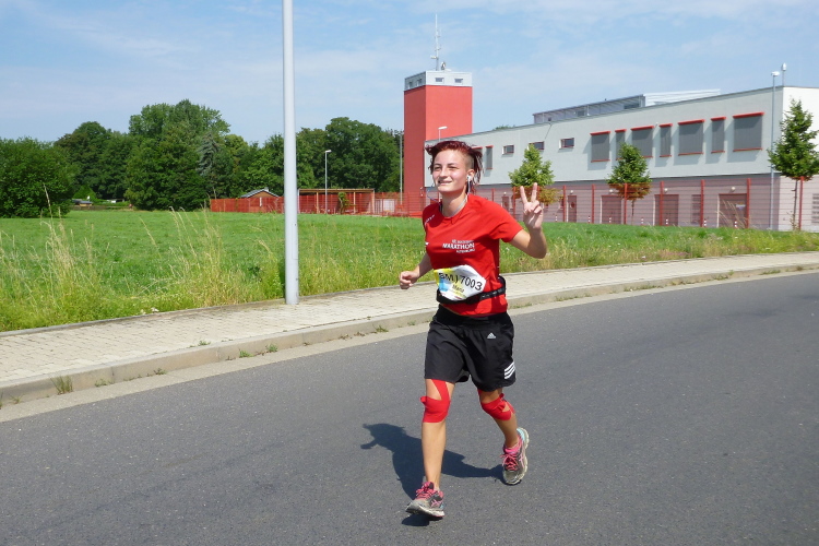 Ein paar Minuten weiter warten dann Helfer vom THW mit dem vollen Verpflegungsprogramm, Auch Schokolade, Riegel, Kekse und Salz werden gereicht. Es mangelt an nichts. Die aufgestellten Stühle in der Sonne bleiben allerdings leer. Gleich danach laufen wir durch das Industriegebiet am Weißen Berg, die Streckenposten haben sich unter einem Sonnenschirm verkrochen, denn ess ist heiß und der Asphalt glüht. Auf den 500 Metern durch den Poschwitzer Park (ein kleiner Rundkurs) kann man sich wieder ein wenig erholen. Doch bei Kilometer 15 stehe ich wieder voll in der Sonne. Genau 93 Minuten bin ich unterwegs. Die vier Stunden sind definitiv nicht zu schaffen. Bodo schickt mich nach vorne.
