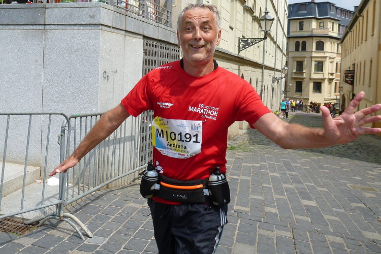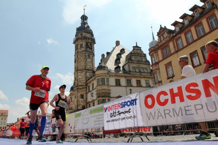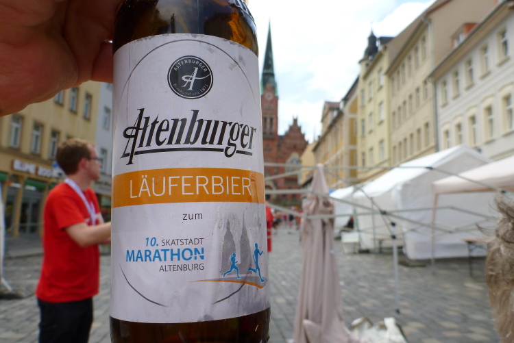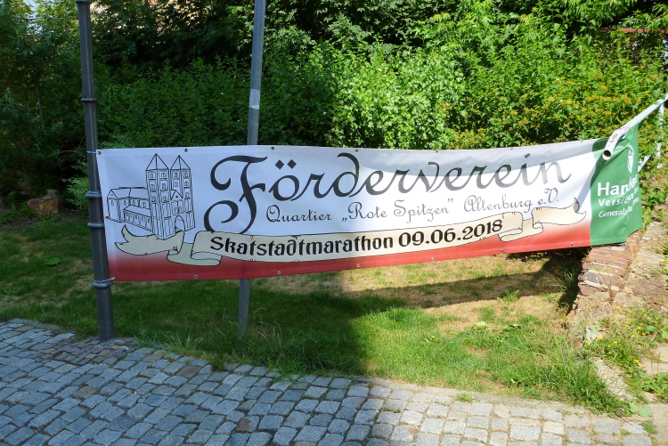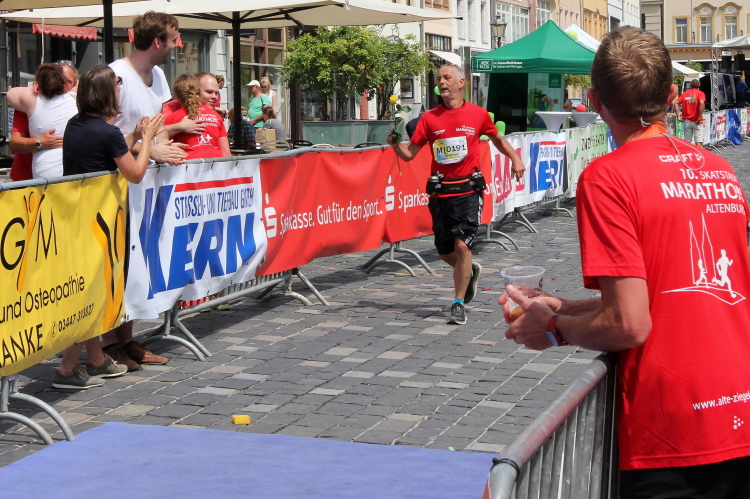 Es geht schon mal an, dass Start und Ziel im Wohnzimmer von Altenburg ist. Auf dem Markt, in Nähe zum Rathaus und der Brüderkirche, laufen alle Fäden zusammen. Wenn du als Zuschauer hier stehst, magst du einfach nicht mehr weggehen. Denn bereits vor dem ersten Start der Marathonis um 09.00 Uhr bis zum Zielschluss nach 6,5 Stunden gibt es keine Sekunde Langeweile. Dafür sorgt der Moderator Stefan Bräuer, die Band „Die Unkomplizierten“, die Sambatänzerinnen, die Verkaufs- und Sponsorenstände und natürlich die Futterbuden. Und die Läufer, die Zug um Zug auf ihren Weg geschickt werden und später hier im Ziel einlaufen.