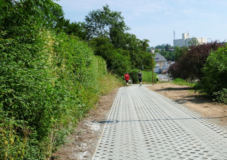 Es geht wieder ins Stadtgebiet, wo wir nach dem Falkenplatz in den Zick-Zack-Weg einbiegen. Der heißt nicht nur so, er ändert tatsächlich seine Richtung alle paar Meter! In der Schwanenstraße grüßt wie jedes Jahr die Familie Dünewald die Läufer, diesmal mit einer Kiste Wassereis zum Kühlen. Kurzzeitig sind die Neuapostolische Kirche und die Herzogin-Agnes-Gedächtniskirche zu sehen. Eine weitere Streckentrennung lässt uns nun einige Gartenanlagen tangieren wie das Friedenseck, den Mühlengrund und die Poschwitzer Höhe. Besonders die letztere kostet nicht nur mir einige Schweißperlen. Ein paar linke Parteigenossen halten mir eine Bierflasche entgegen, einen Öffner haben sie offenbar nicht. Da hilft der Tipp des Bayern: „Haut die Flasche am Biertisch doch auf.“ Gesagt, getan.