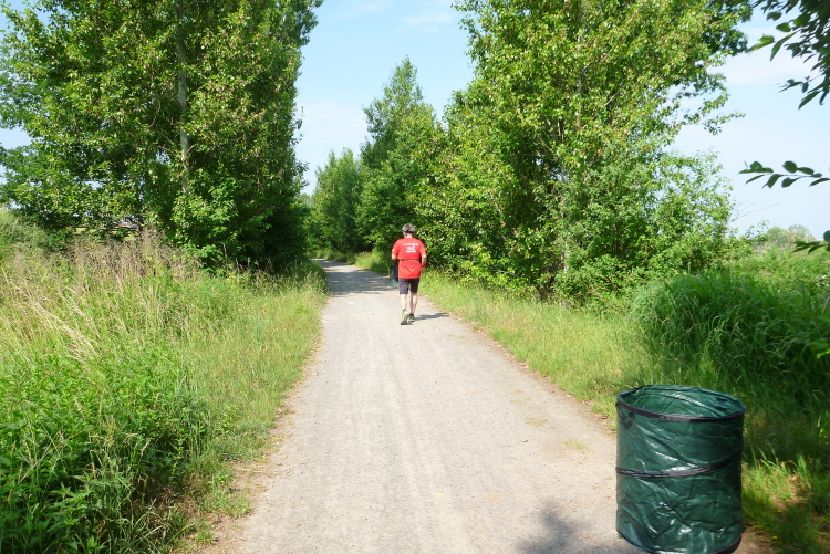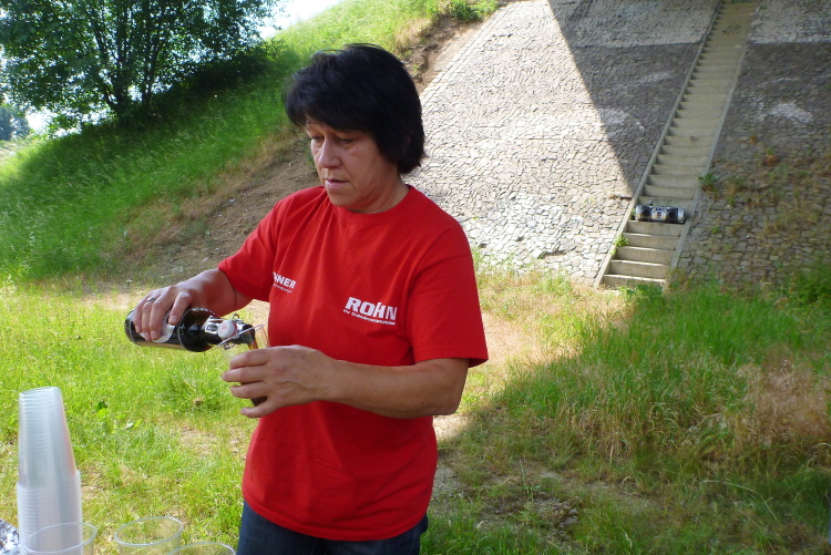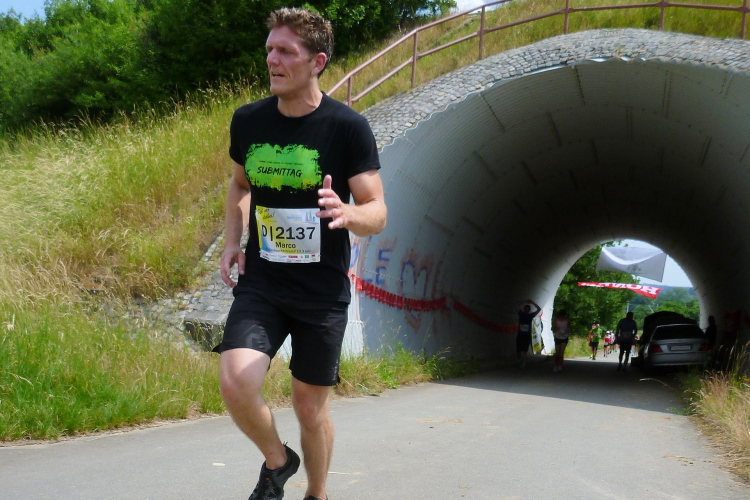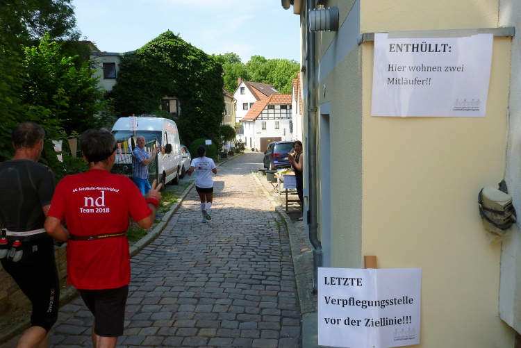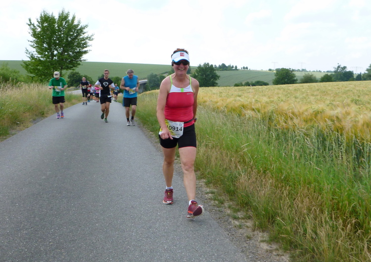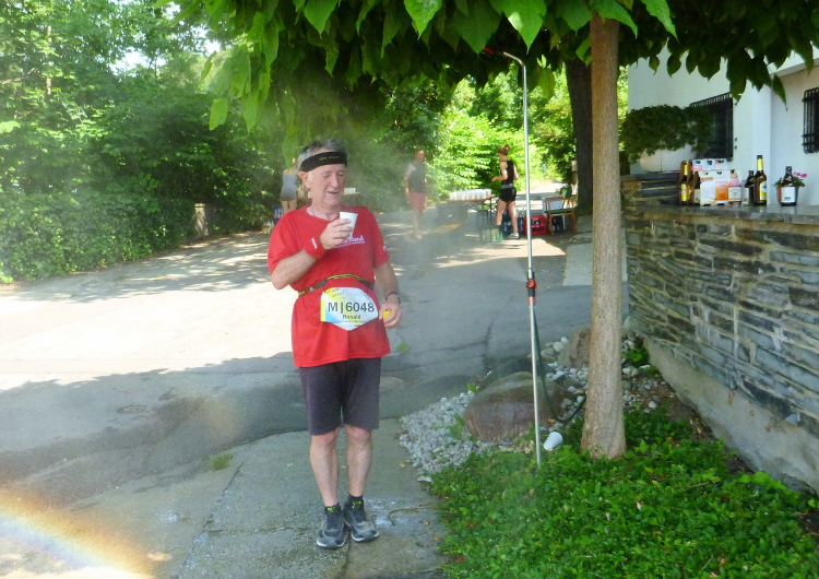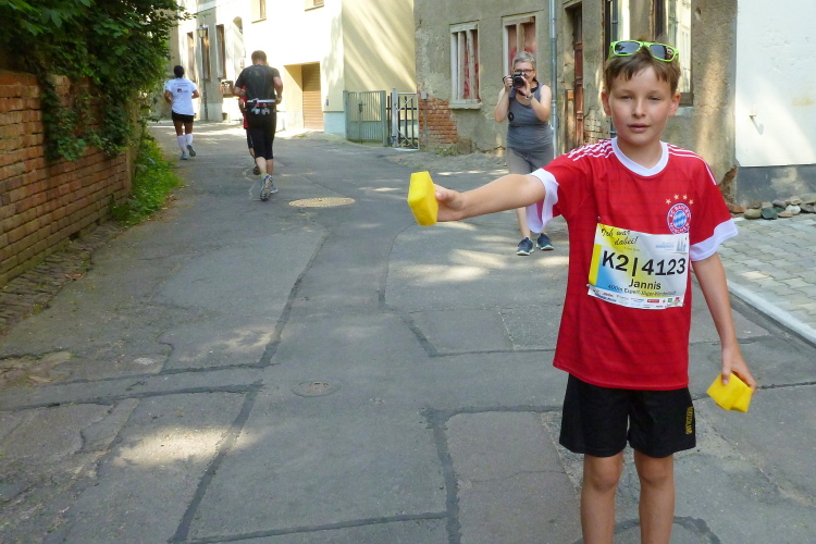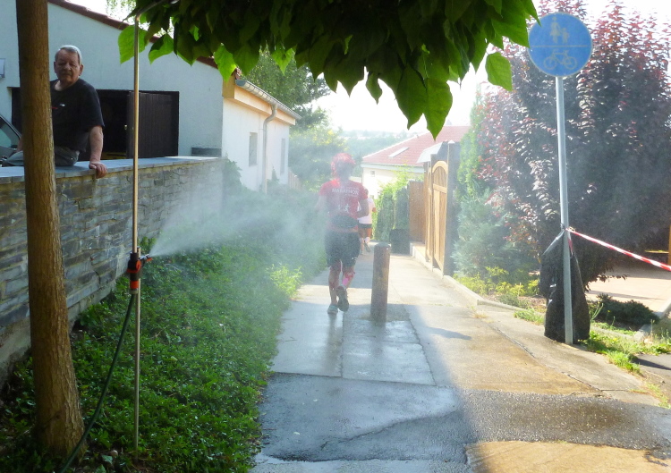 Vor dem Industriegebiet muss ich eine Läuferin zurückpfeifen, sie hat die Richtungsänderung nicht mitbekommen und ist auf dem falschen Weg. Noch mehr private Wasserstellen als in der ersten Runde sind jetzt aufgebaut. Die Anwohner am Kurs machen einen guten Job, das muss ich jetzt einfach sagen. Ich komme noch ohne Gehpause die Poschwitzer Höhe hinauf, andere hängen schon arg durch. Die Restkilometer sind längst einstellig, als sich jetzt auch die Walker zu uns gesellen. Da musst man halt ein wenig aufpassen, denn nicht jeder behält seine Stecken bei sich.