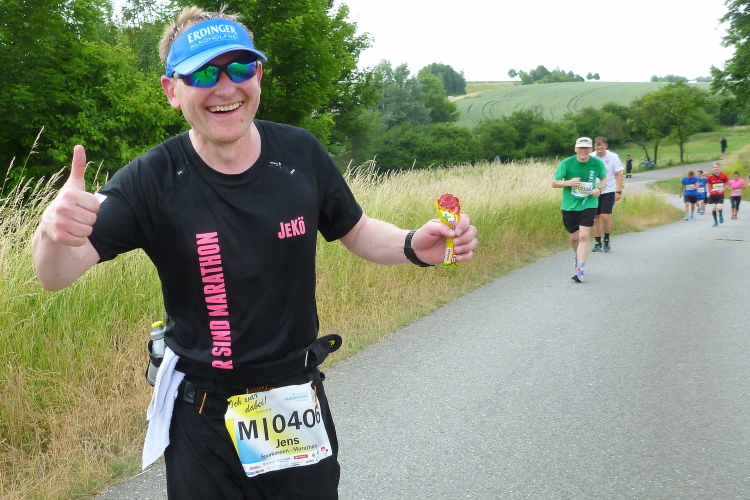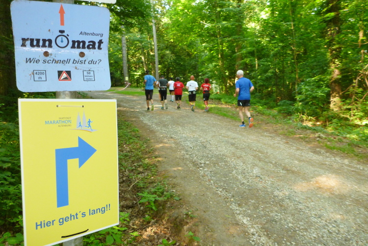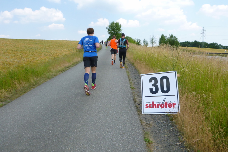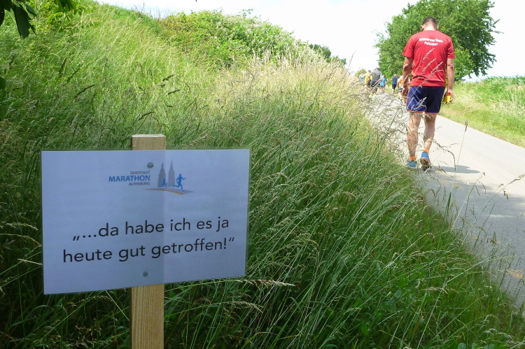 Einen halben Kilometer dürfen wir uns bis zum Ortseingang Münsa erholen, wo eine weitere V-Stelle wartet. Das Helferteam hat frühere Laufshirts, bestimmt 20 an der Zahl, am Rand aufgehängt. Und dann frage ich (nur zum Spass natürlich) nach einem Altenburger. Gemeint ist das Produkt einer im Jahr 1871 gegründeten Firma, welche sich auf das Brauwesen spezialisiert hat. Ein Schwarzes wird mir vor die Nase gehalten. „Du bist schon der Dritte, der nach Bier fragt.“ Leikeim aus Burkunstadt hat die Brauerei aufgekauft und hat in den letzten Jahren den Betrieb behutsam modernisiert, ohne den Bezug an die Region zu verlieren. Beschwingt hopple ich weiter. Bei Kilometer zehn bin ich ziemlich genau eine Stunde unterwegs.
