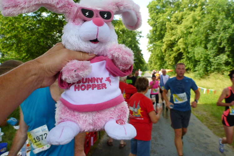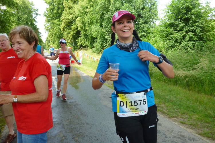 Soll ich jetzt Gas geben, frage ich mich. Häufig mache ich das so auf einem Zweirunden-Kurs. Aber heute bei knapp 30 Grad? Ich lasse Vernunft walten und versuche einfach, das Läufchen zwar langsam, aber ohne Gehpausen zu fortzusetzen und mich an jeder Trinkstation abkühlen. Nur nicht überhitzen.