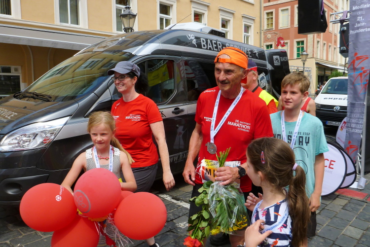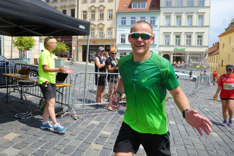 Mein allerhöchster Respekt gilt jedoch Helmut Nitschke, dem Pressesprecher im Orga-Team. Er hat es hingekriegt, dass er den Jubiläums-Marathon selber mitlaufen kann, was dann gleichzeitig sein insgesamt 50. ist. Leicht war er nicht, sein „Marathon dahoam“. Das Finale ist einzigartig. Stefan Bräuer, für mich das Kreuz As unter den Moderatoren, schafft es mit Sprüchen, heißen Rhythmen und Freibier, eine ansehnlich Menge Zuschauer auf dem Marktplatz zu halten, um Helmut einen Empfang zu bereiten, der nicht nur ihn zu Tränen rührt. Wahnsinn.