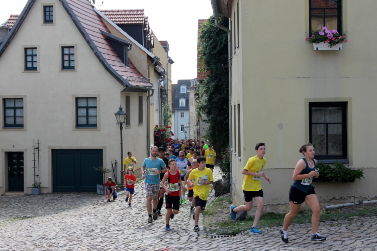 Die letzten Sekunden werden heruntergezählt und dann werden die 130 Marathonis losgelassen. Es wird wohl eine Hitzeschlacht werden, das befürchte ich, denn jetzt hat es schon über 20 Grad. Wir springen über das Kopfsteinpflaster am Marktplatz, leicht bergab, laufen linkerhand am Rathaus vorbei, das in den Jahren 1561 bis 1564 im Renaissance-Baustil errichtet wurde. Markant ist an der Front der achteckige Turm. Durch die Topfgasse, Kesselgasse und den Roßplan geht es zuerst hinunter, dann hinauf. Ich muss jetzt schon schnaufen wie ein Walross. Das wird noch was werden. Die erste Steigung haben wir am Nikolaikirchhof schon hinter uns gebracht. Auf dem Platz laufen wir am Kirchturm vorbei, ein Rest der Nikolaikirche, die im 16. Jahrhundert abgerissen wurde. Der 45 Meter hohe Turm kann bestiegen werden.