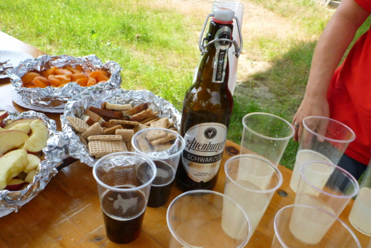 Wenn die Steigung im Stadtwald nicht wäre, könnte ich glatt ein wenig regenerieren. Am Ende der Steigung kommt die Spitze des 13,3 Kilometer-Laufes. Die haben einen Speed drauf. Derweil hole ich Alexander vom SV Rote Socken ein. Soweit ich mich erinnere, wollte er schon letztes Jahr das Bier nicht, das jetzt im Stadtwald angeboten wird. Ich übernehme seine Ration.