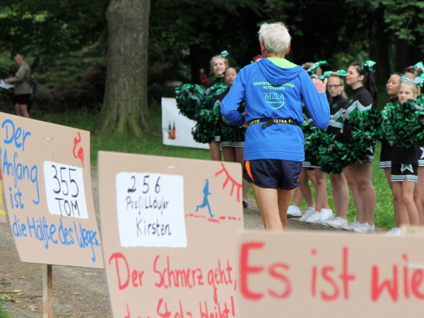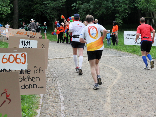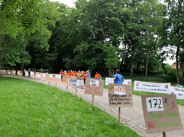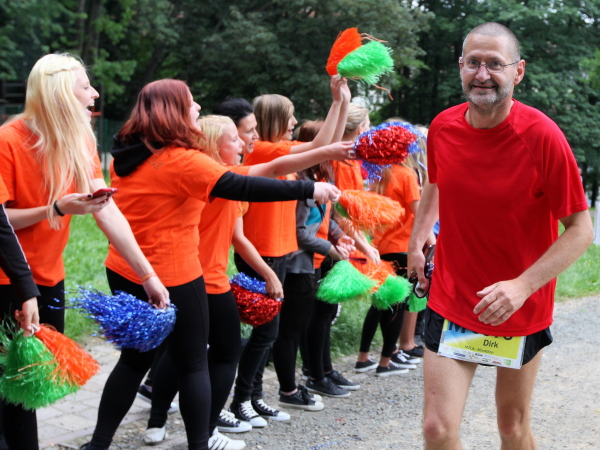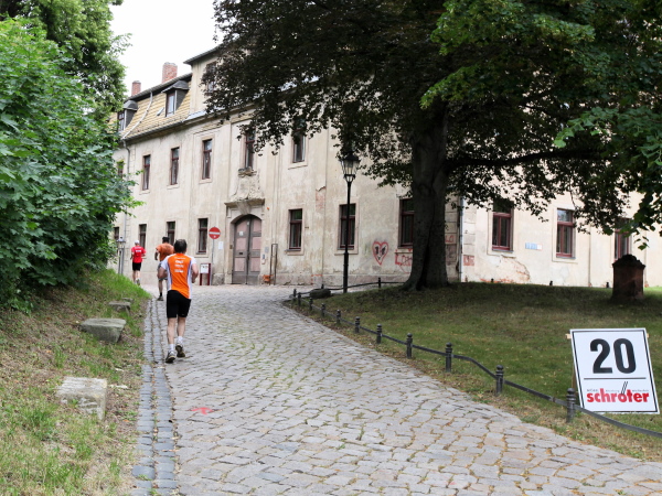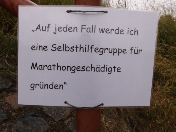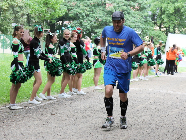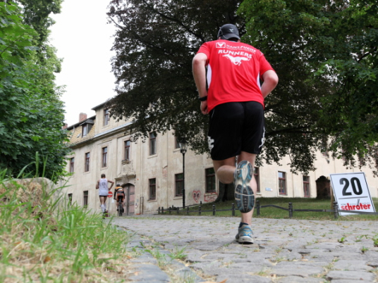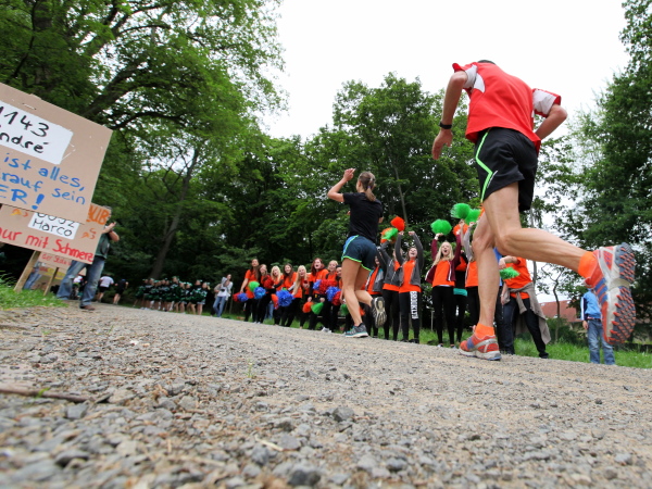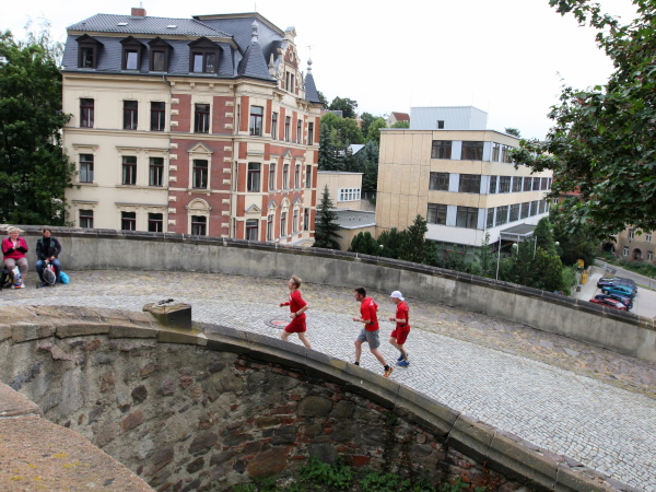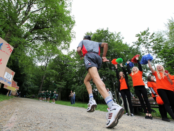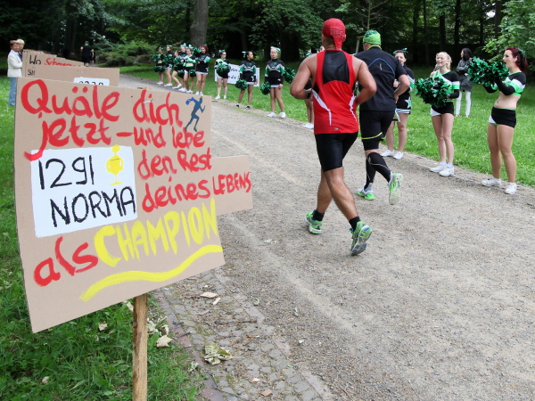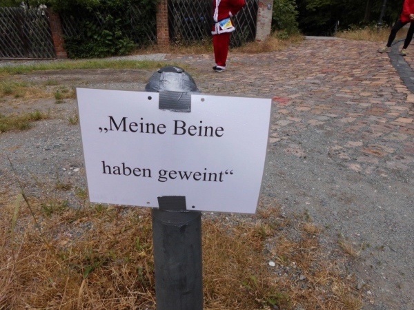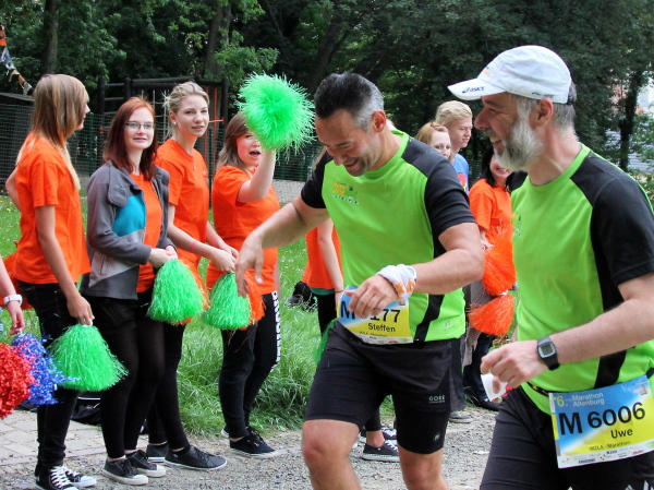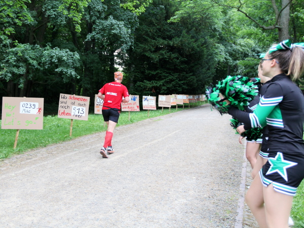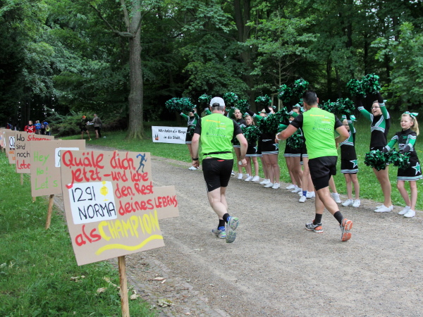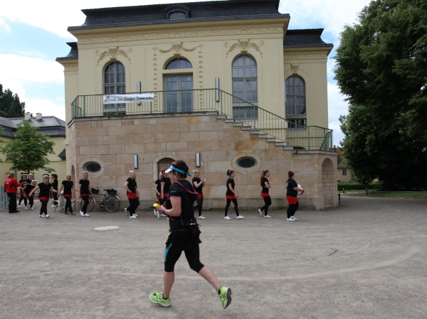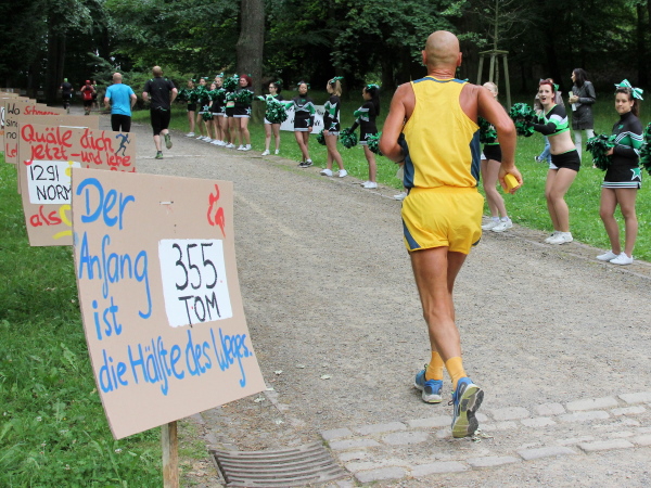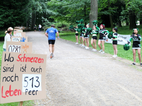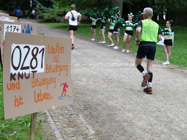 Ich frage mich, was die sich früher gedacht haben, als sie den Schlossgarten angelegt haben. Sind die Herzöge von Sachsen-Altenburg wirklich freiwillig diesen Berg hochgelaufen? Würde ich nie tun – wenn ich Herzog wäre. Bin aber leider nur ein Marathonläufer und so muss ich da hoch. Und muss sagen, es hat sich gelohnt. So steil der Anstieg ist, so kurz ist er – und so unterhaltsam. Große Tafeln sind aufgestellt, mit Startnummern und klugen Sprüchen versehen. Hat man die Hälfte geschafft, wird man von einer Gruppe Cheerleader angefeuert. Klaus Duwe hat dieses Highlight auch entdeckt und fotografiert mich, als ich an dem Spalier schöner Mädchen vorbeisprinte. Zehn Meter Sprint– dafür reicht die Puste…