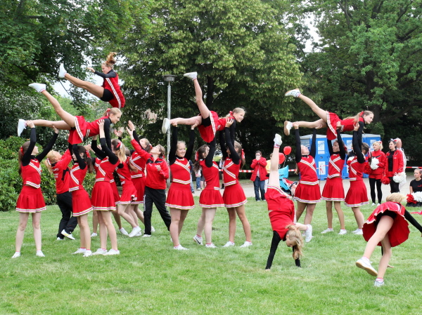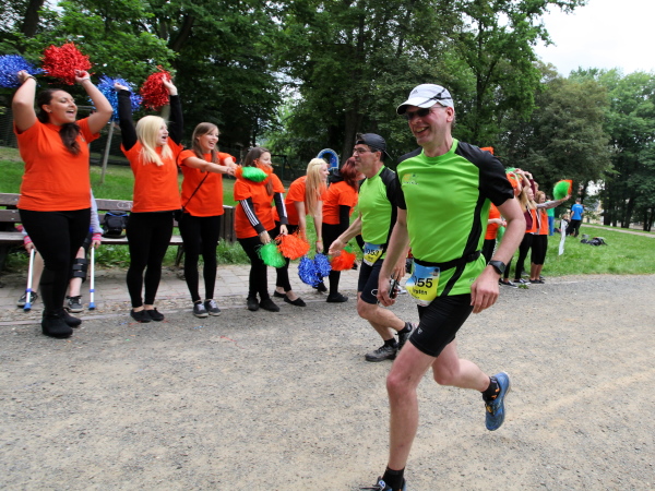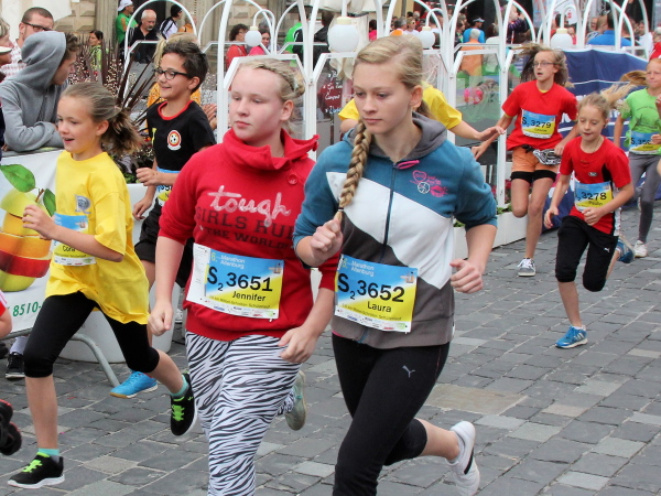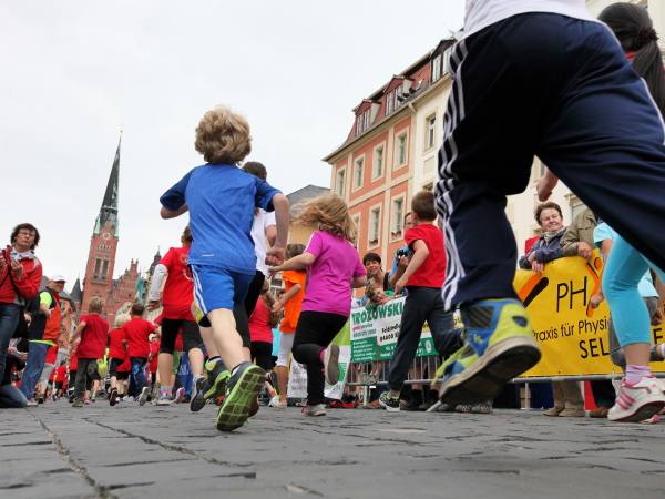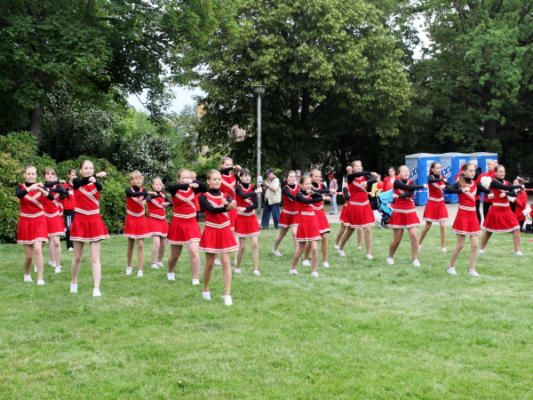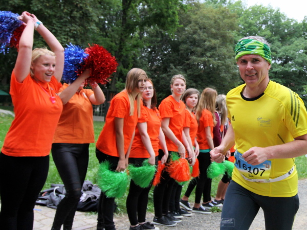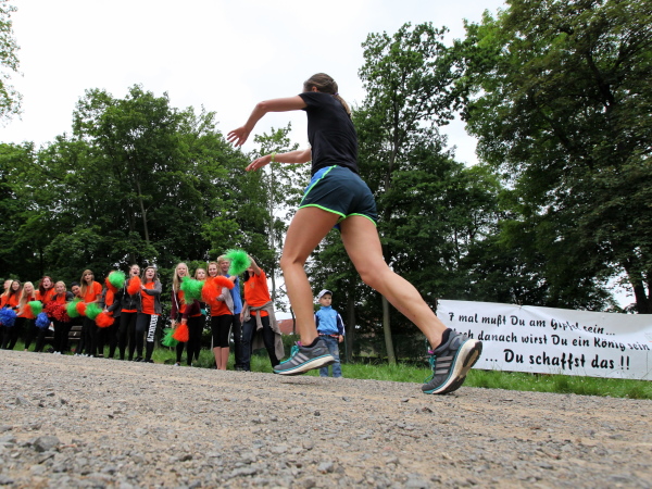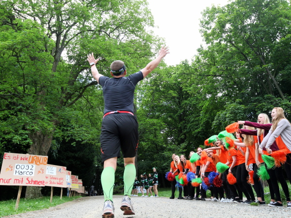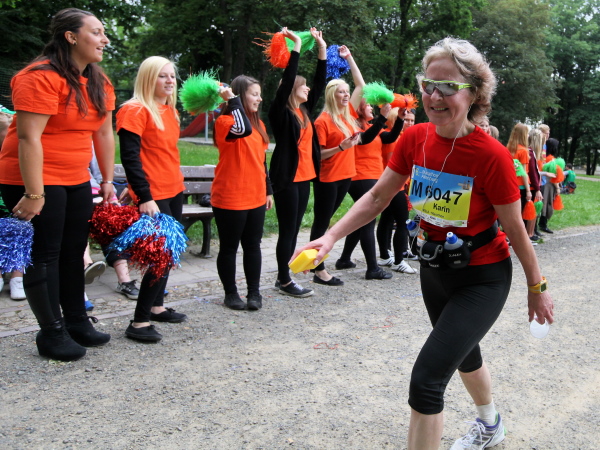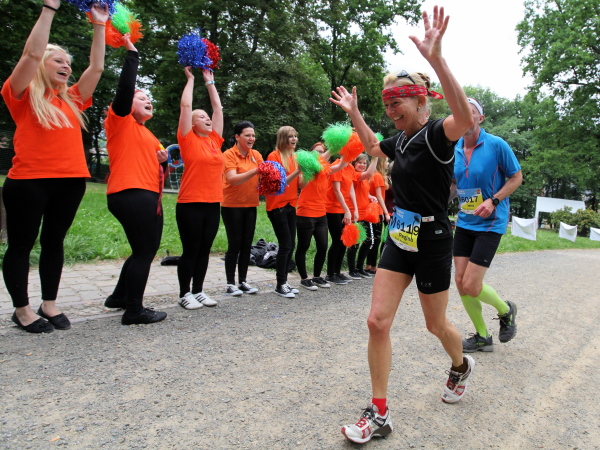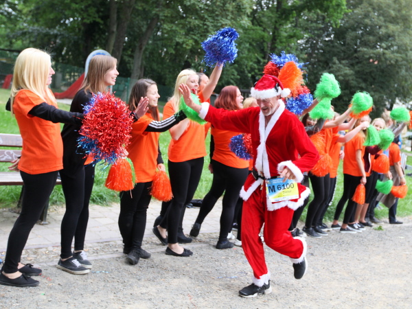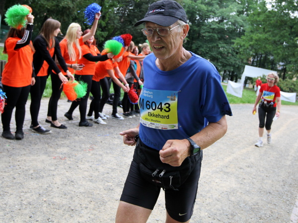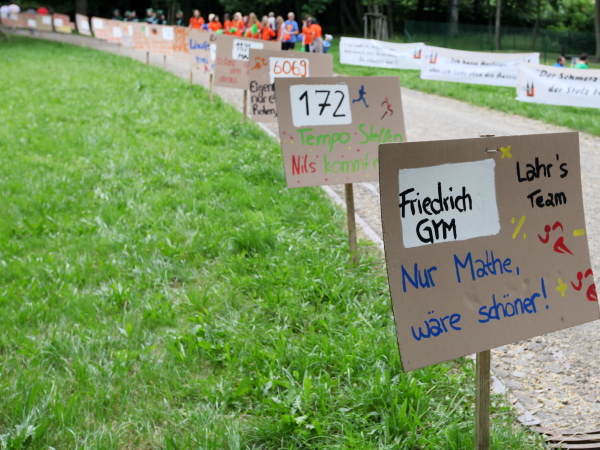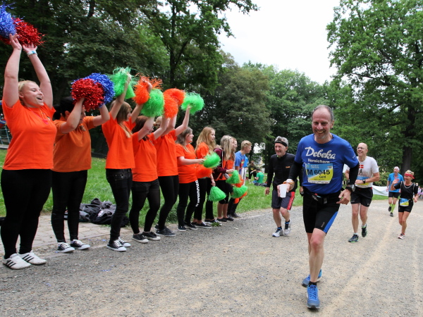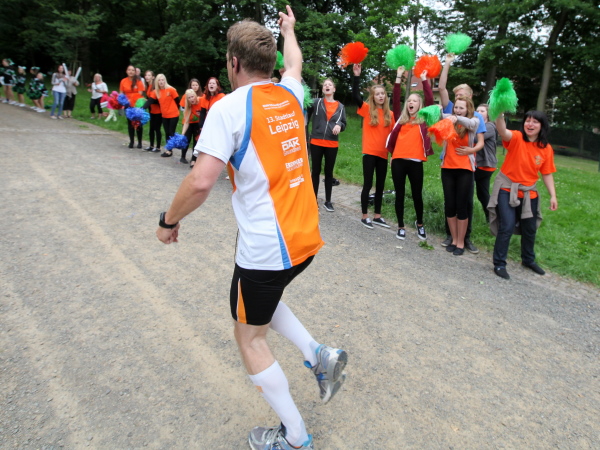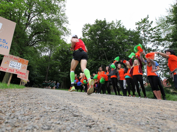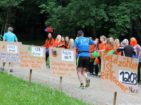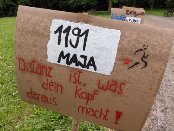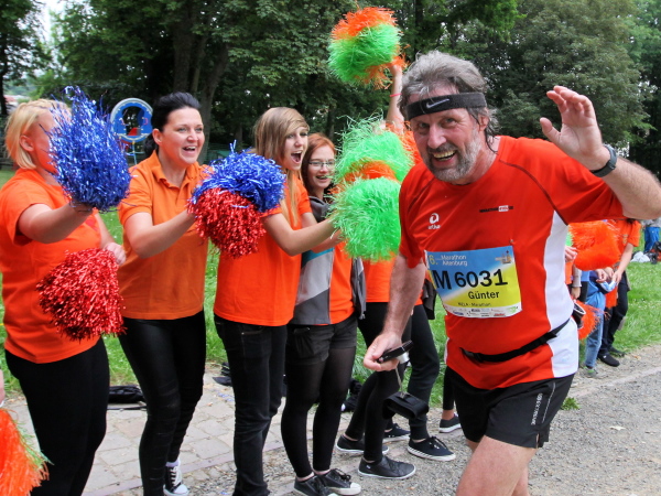 Ich frage mich, was die sich früher gedacht haben, als sie den Schlossgarten angelegt haben. Sind die Herzöge von Sachsen-Altenburg wirklich freiwillig diesen Berg hochgelaufen? Würde ich nie tun – wenn ich Herzog wäre. Bin aber leider nur ein Marathonläufer und so muss ich da hoch. Und muss sagen, es hat sich gelohnt. So steil der Anstieg ist, so kurz ist er – und so unterhaltsam. Große Tafeln sind aufgestellt, mit Startnummern und klugen Sprüchen versehen. Hat man die Hälfte geschafft, wird man von einer Gruppe Cheerleader angefeuert. Klaus Duwe hat dieses Highlight auch entdeckt und fotografiert mich, als ich an dem Spalier schöner Mädchen vorbeisprinte. Zehn Meter Sprint– dafür reicht die Puste…