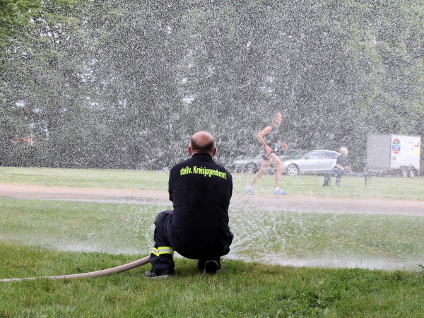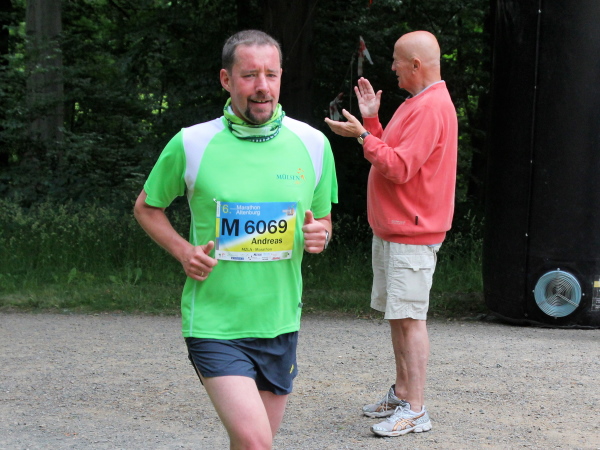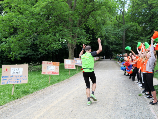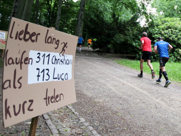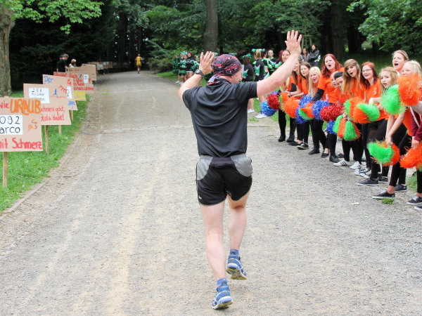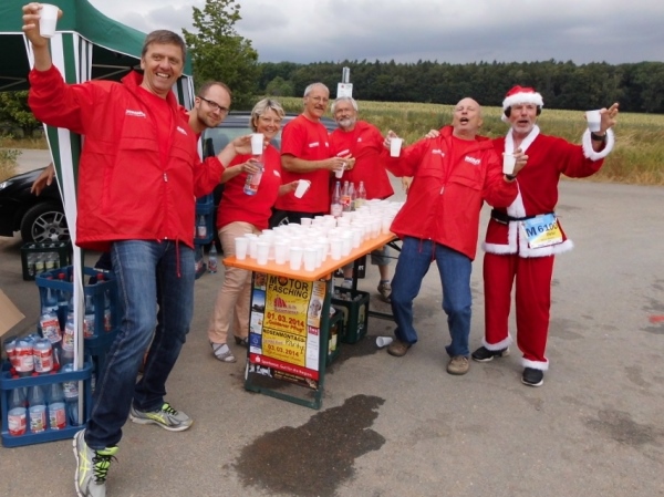 Bei Kilometer 5 erreichen wir die erste Verpflegungsstelle. Ihr kennt ja den Läuferspruch: Wenn du noch singen kannst, bist du zu langsam…Trifft der auch auf Helfer zu? Die Helfer haben Aufstellung genommen, bilden den „Stadtwaldchor“ und singen „Happy birthday“ in dem Moment, als Geburtstagskind Dirk dort auftaucht. Das muss man sich mal überlegen: Sein Geburtstag hat sich bis in den Wald herumgesprochen - ein Wunder! Oder einfach nur gute Organisation…